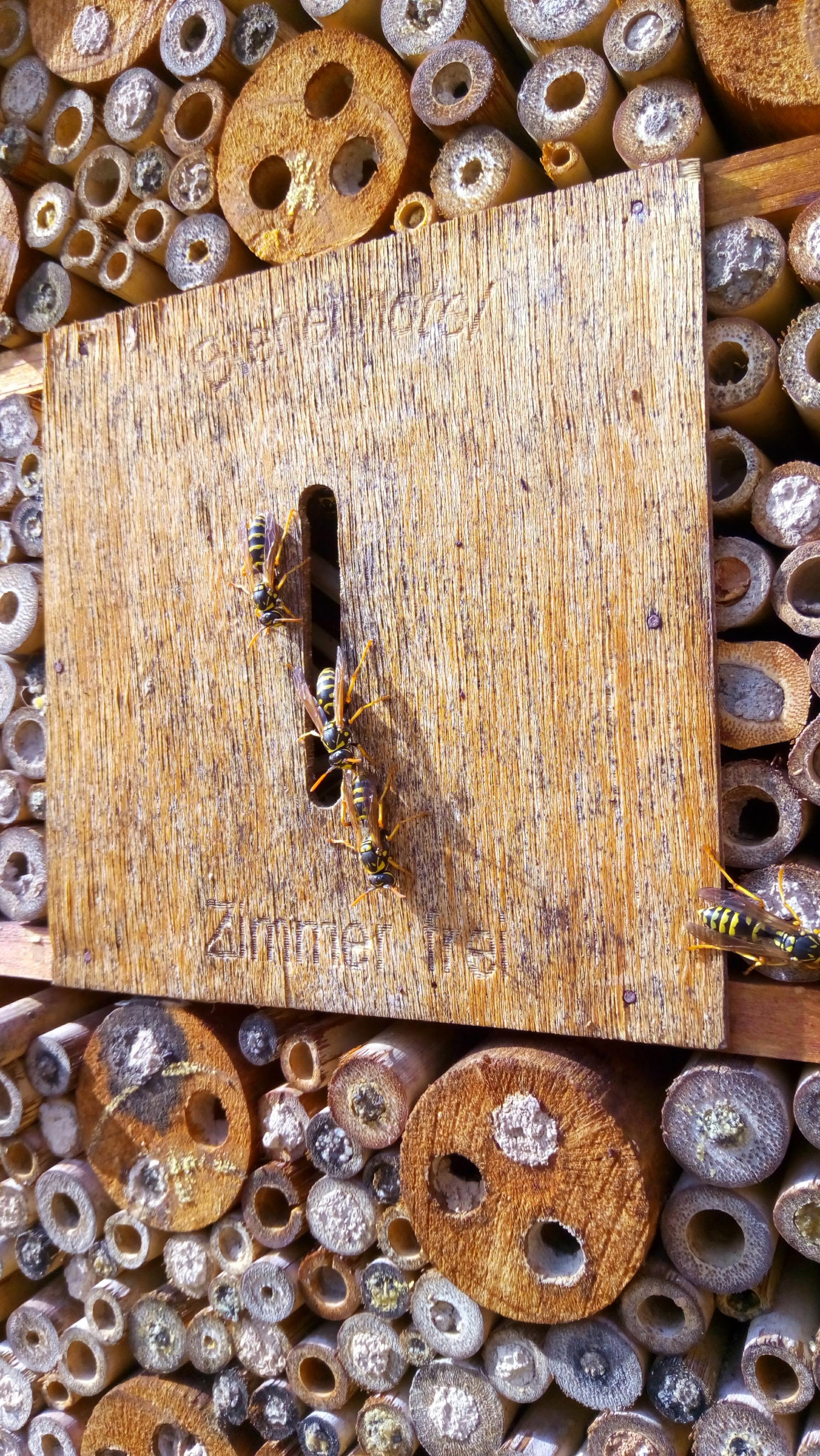 Unter der Überdachunghaben sich Feldwespen eingefunden. Sie suchen ein Plätzchen für ihre Waben.