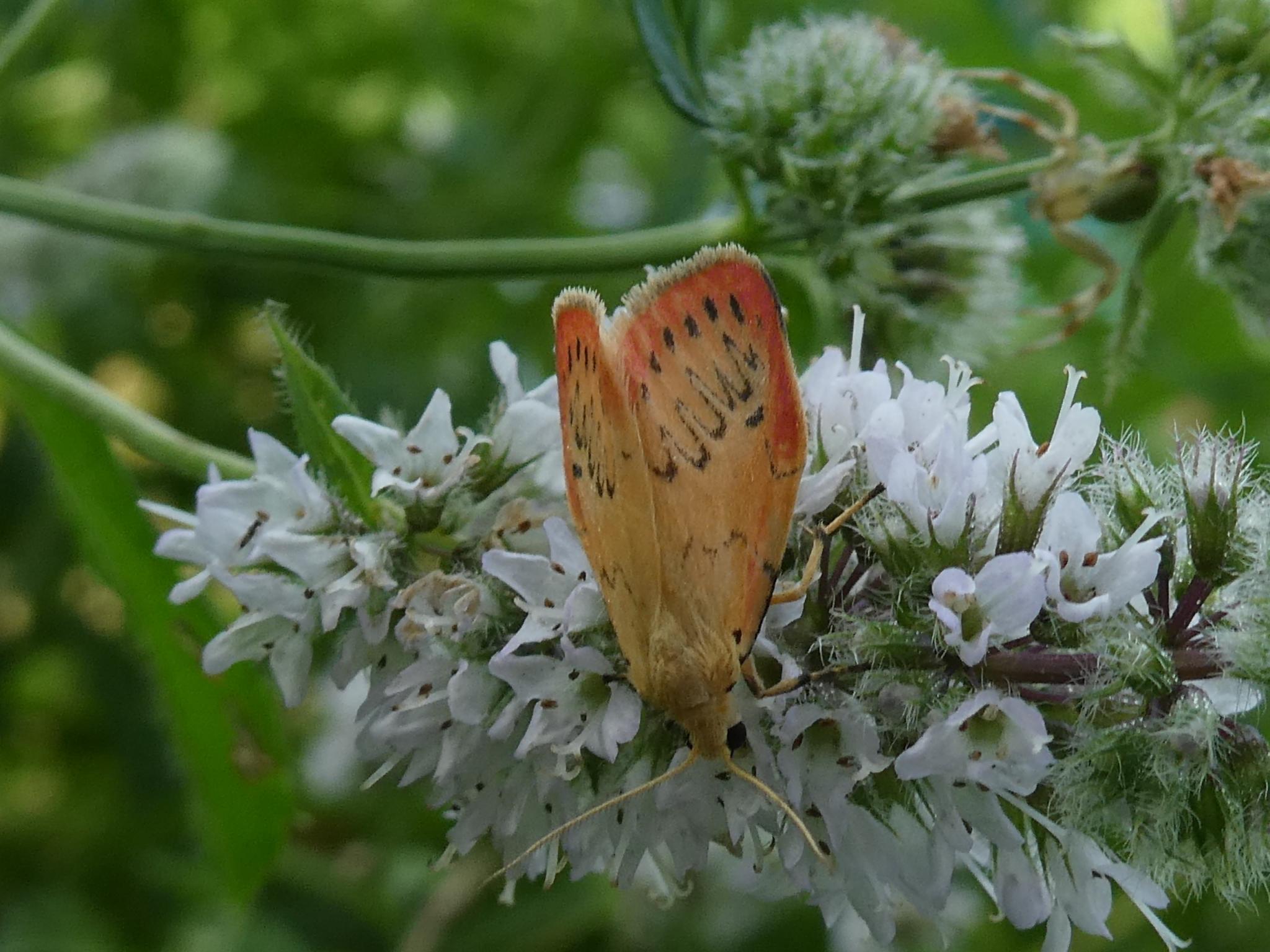 das ist ein Rosen-Flechtenbärchen (Miltochrista miniata). Wirklich sehr hübsch und wieder an Deiner Minze.