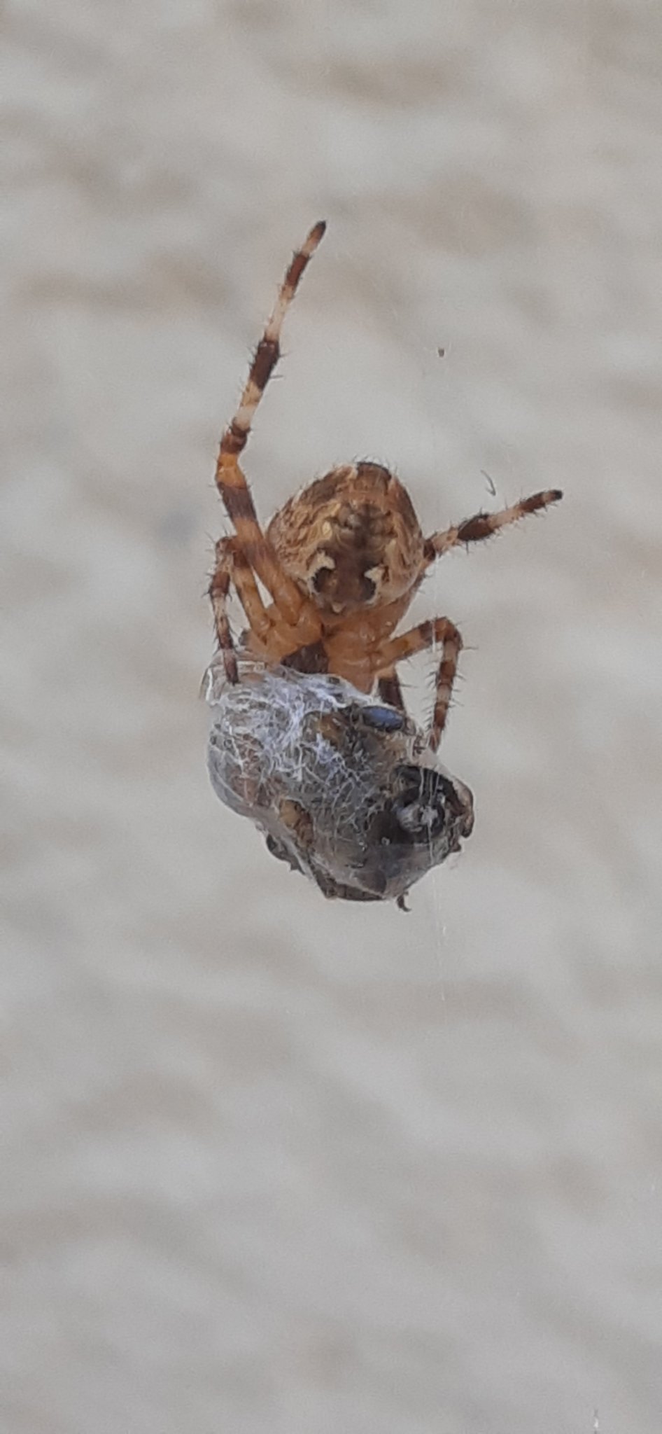 Jepp, Gartenkreuzspinne (Araneus diadematus). Schönes Weibchen. Was sie da einwickelt ist wirklich schwer zu sagen. Vielleicht eine Biene. Möglicherweise ist die Spinne mit ihrer Mahlzeit schon fertig und entsorgt nur noch die leere Insektenhülle.