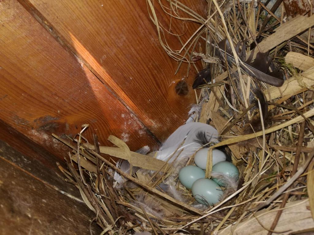 Vier Eier in einem Kasten - und ein weiteres Weibchen steht kurz vor der Ablage (Nest ist fertig).