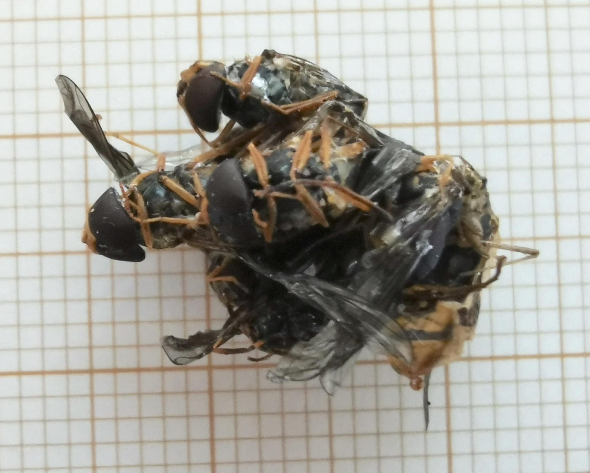 Vorgestern habe ich erstmals in einem Kasten einen Futterballen gefunden, der irgendwie verlorenging. Er lag neben dem Nest und besteht aus etwa 8 zusammengeklebten Hautflüglern von repektabler Grösse.
