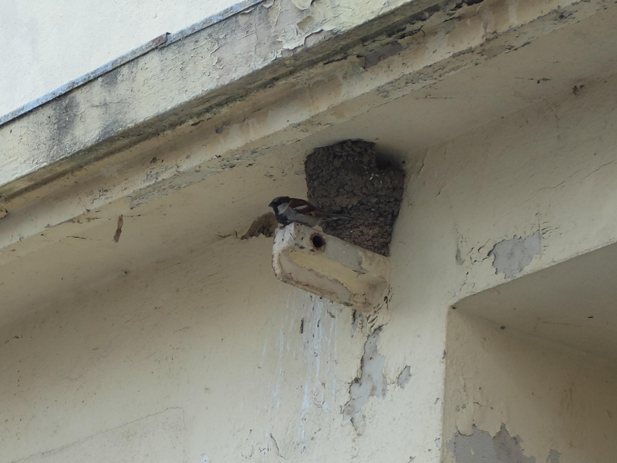 Allerdings wurde es von einem "bösen" Hausspatzmännchen okkupiert, sodass das arme Schwalbenpärchen im Hausgang ausharrte und immer wieder Anflugversuche machte.