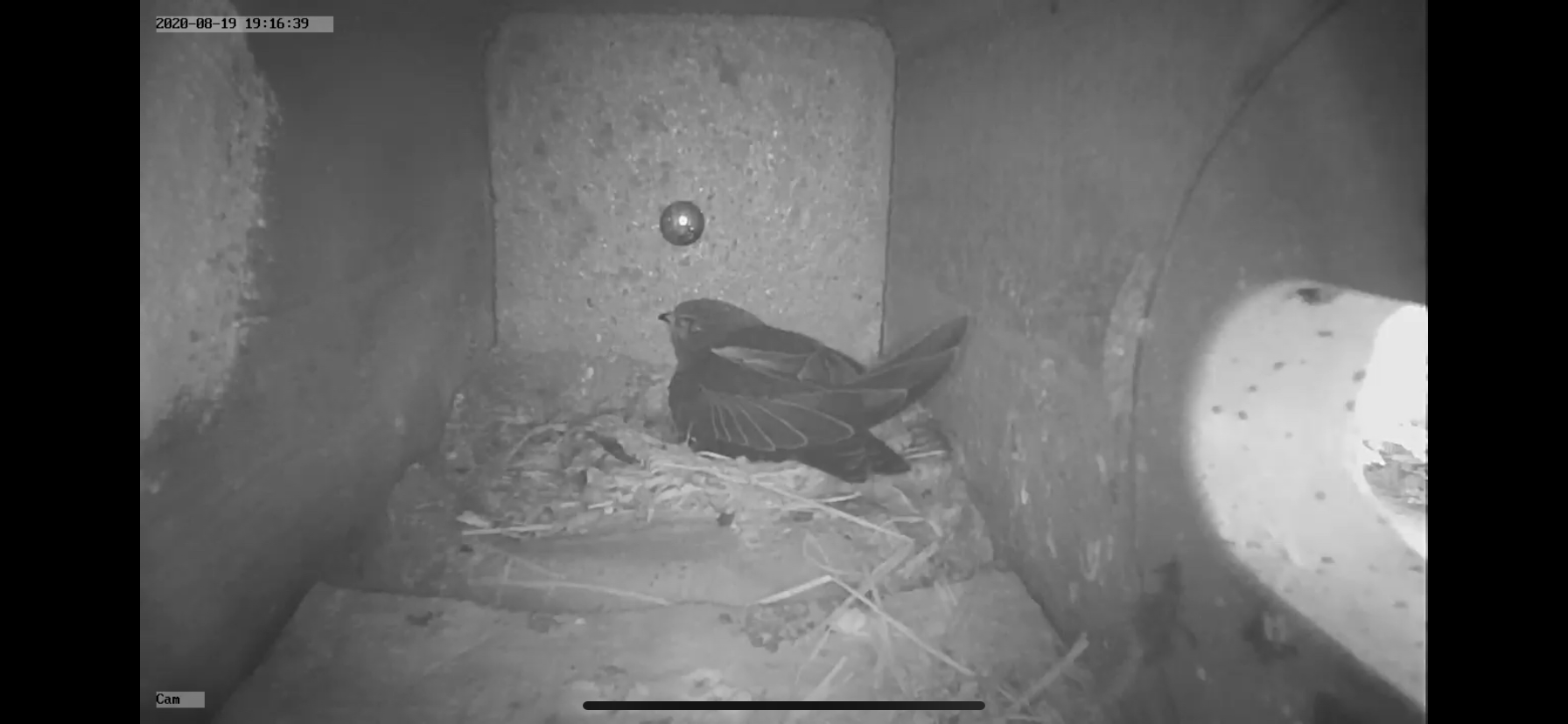 Der Altsegler kam zur Fütterung. Ich konnte nicht sehen, wer die Portion bekam. Er flog noch einmal aus und kehrte kurz vor Einbruch der Dunkelheit zurück. Es ist inzwischen schon um 20.50 Uhr dunkel bei uns am Bodensee.