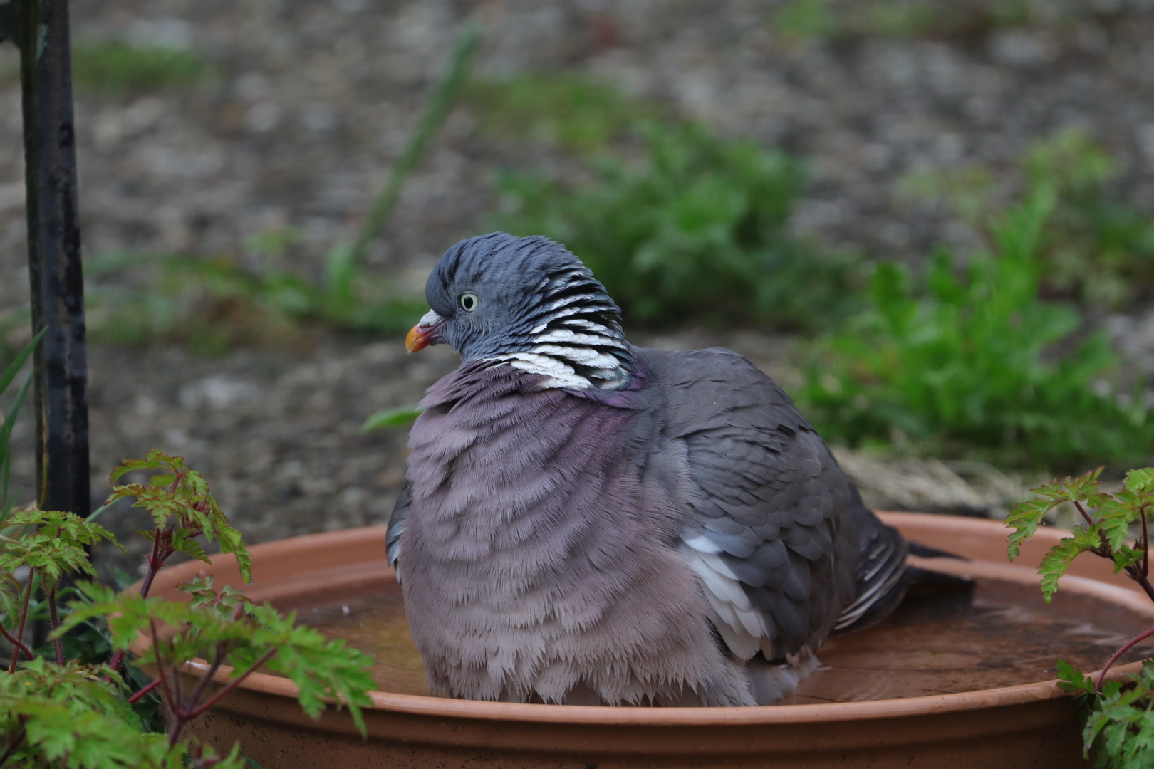 Die Ringeltaube stolzierte bei stärkerem Regen durch den Garten und ließ sich abwechseln unter die Flügel regnen.
