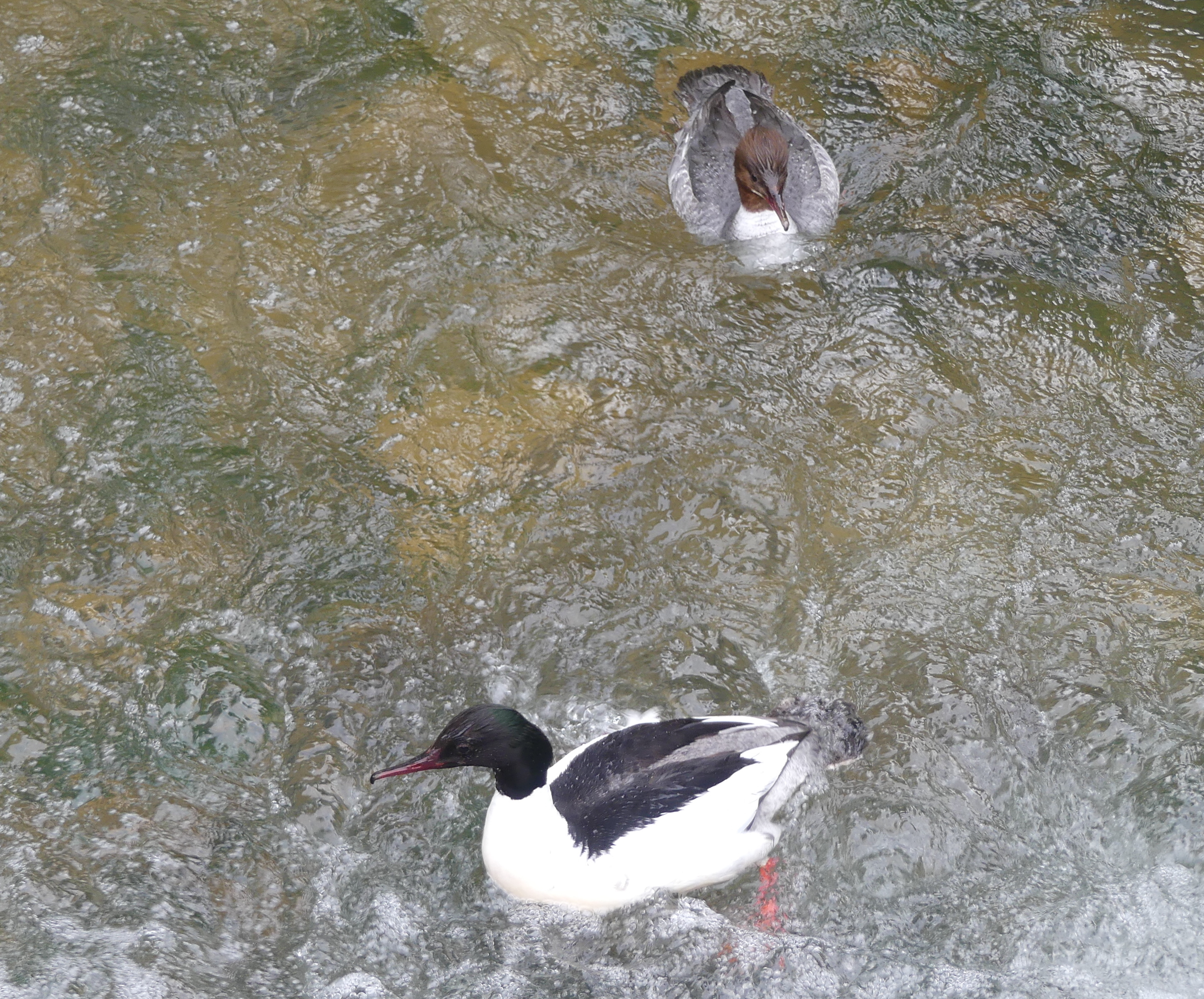 Hier noch ein Foto des Gänsesägerpaares in unserem Bach wie es die Strömung unterhalb einer Staustufe geniesst.