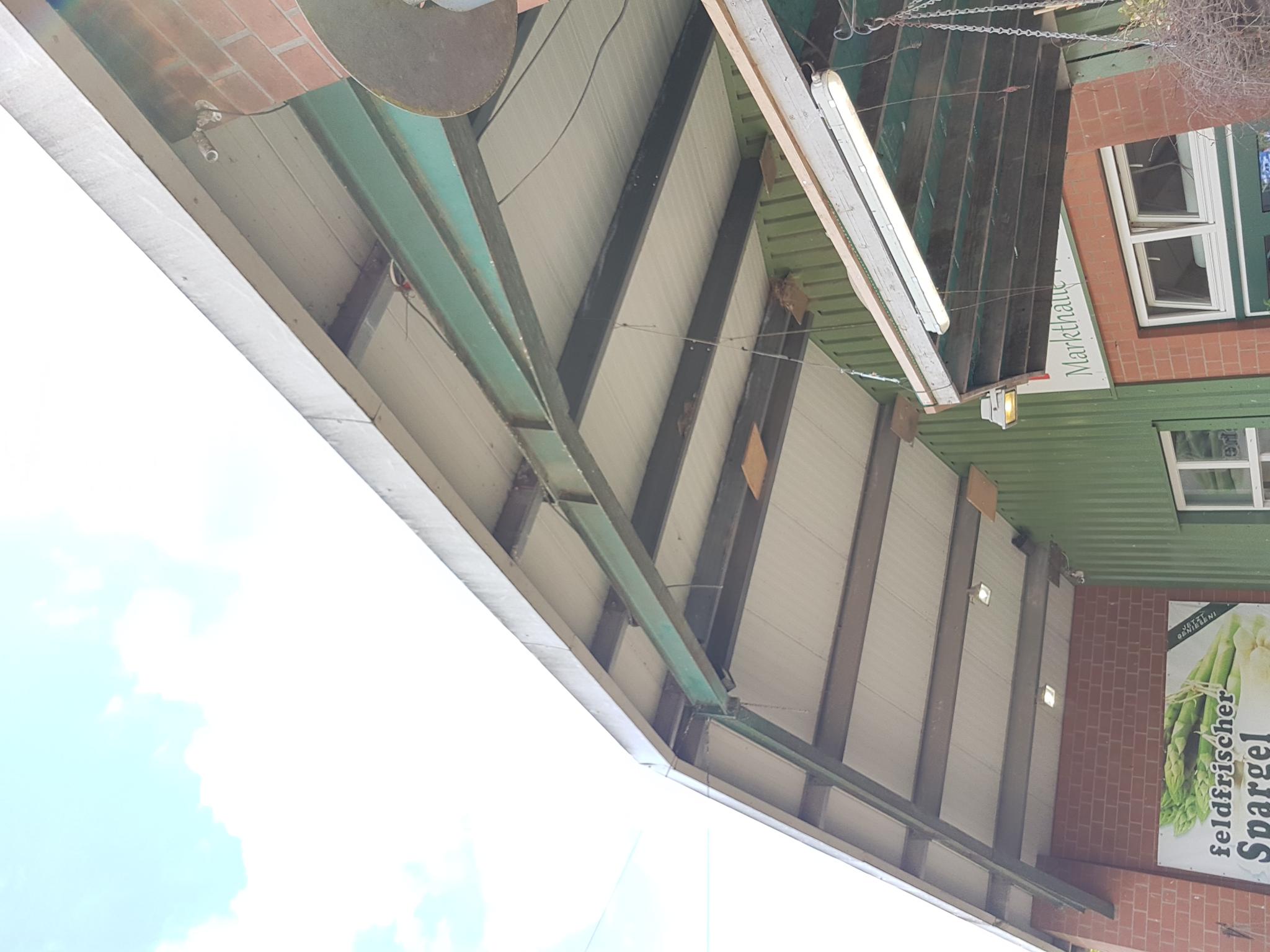 das Foto zeigt das Vordach eines Hofladens hier im Ort, unter dem sich seit Jahren bis zu 15 Rauchschwalben-Nester befinden.