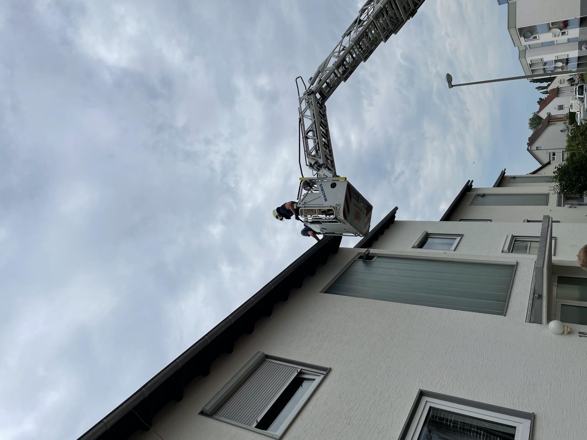Sie verständigten dann die Leitstelle und dann kam das Drehleiterfahrzeug.Nach einigen Erklärungen von mir fuhren sie dann die Leiter aus .Ein Feuerwehrmann meinte dann noch,wenn er den Vogel anfassen würde,würden ihn die Eltern nicht mehr annehmen ! Was sich Ammenmärchen doch über die Generationen halten-!Als er dann kein Nest sah und meinte den Juv. nicht wieder einsetzen zu können,sagte ich er solle die Dachpfannen anheben und darunter schauen.Dort fand er dann ein Nest mit noch zwei Juv.zu denen er den geretteten Segler zusetzte.