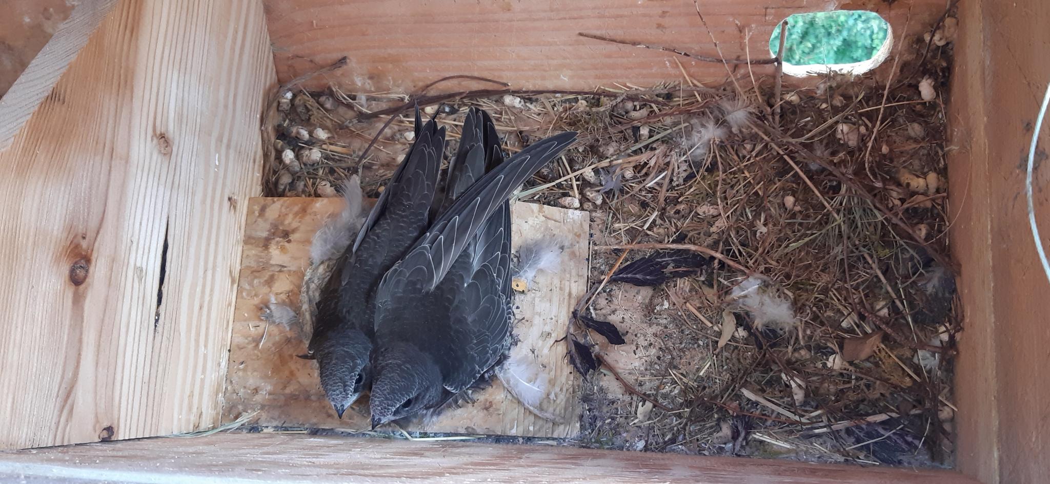 ) Am 29. Juni schlüpfte ein gesundes Küken, am 05. Juli zog ein neues Verlobungspaar in den Nachbarkasten ein (Hurra! Eine Besiedlung klappt mit dem eingebauten Tunnel, er ist nicht zu lang oder zu glatt), am 09. August fliegt das Küken aus.