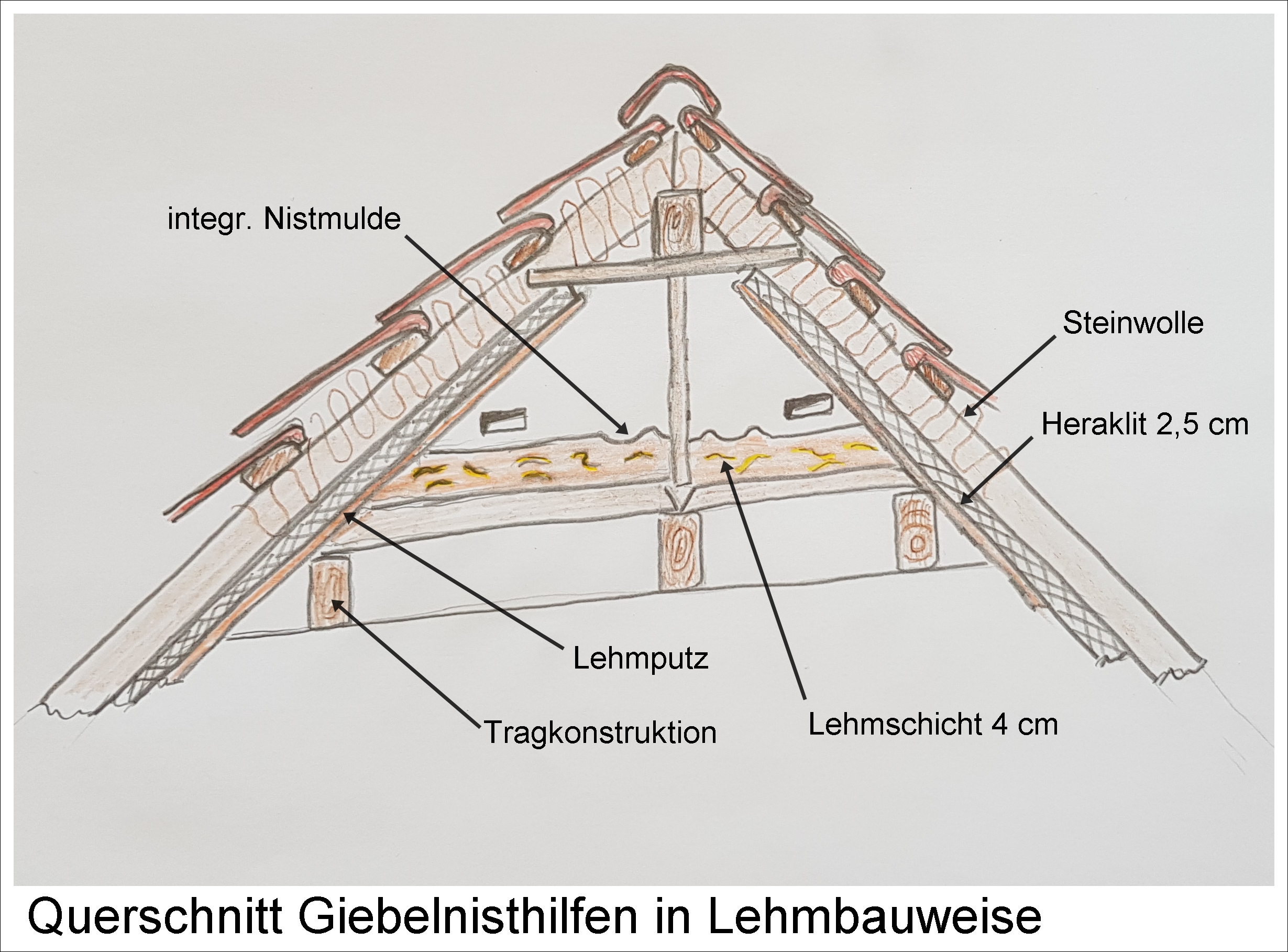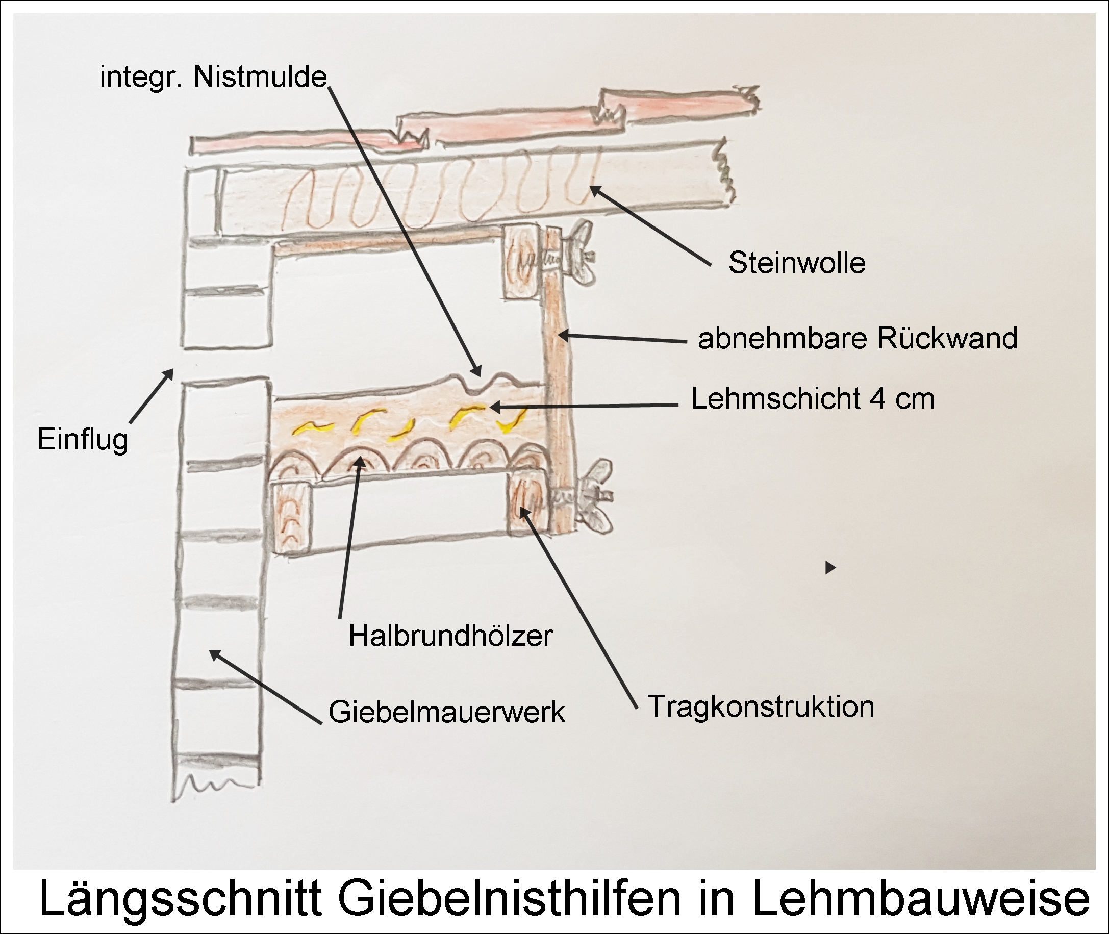 Abschließend zu Giebelnisthilfen spendiere ich noch Längs und Querschnittskizzen meiner Nisthilfen an der Doppelgarage. Durch Isolierung und Bauweise versuche ich das Aufheizen unter den Dachziegeln zu reduzieren. Die letzten drei heißen Sommer hat diese Bauweise ohne Jungvogelhitzeflucht überstanden.