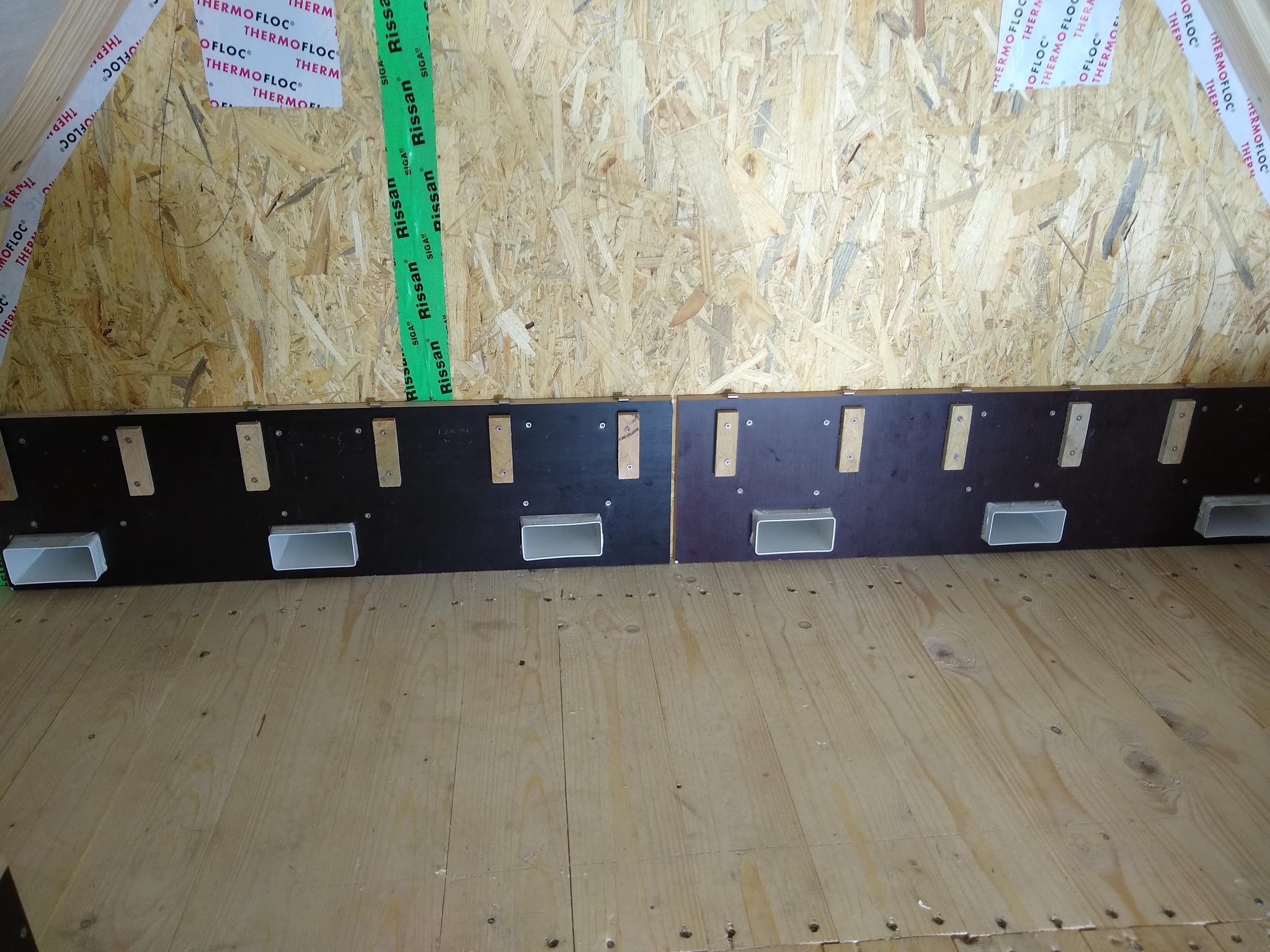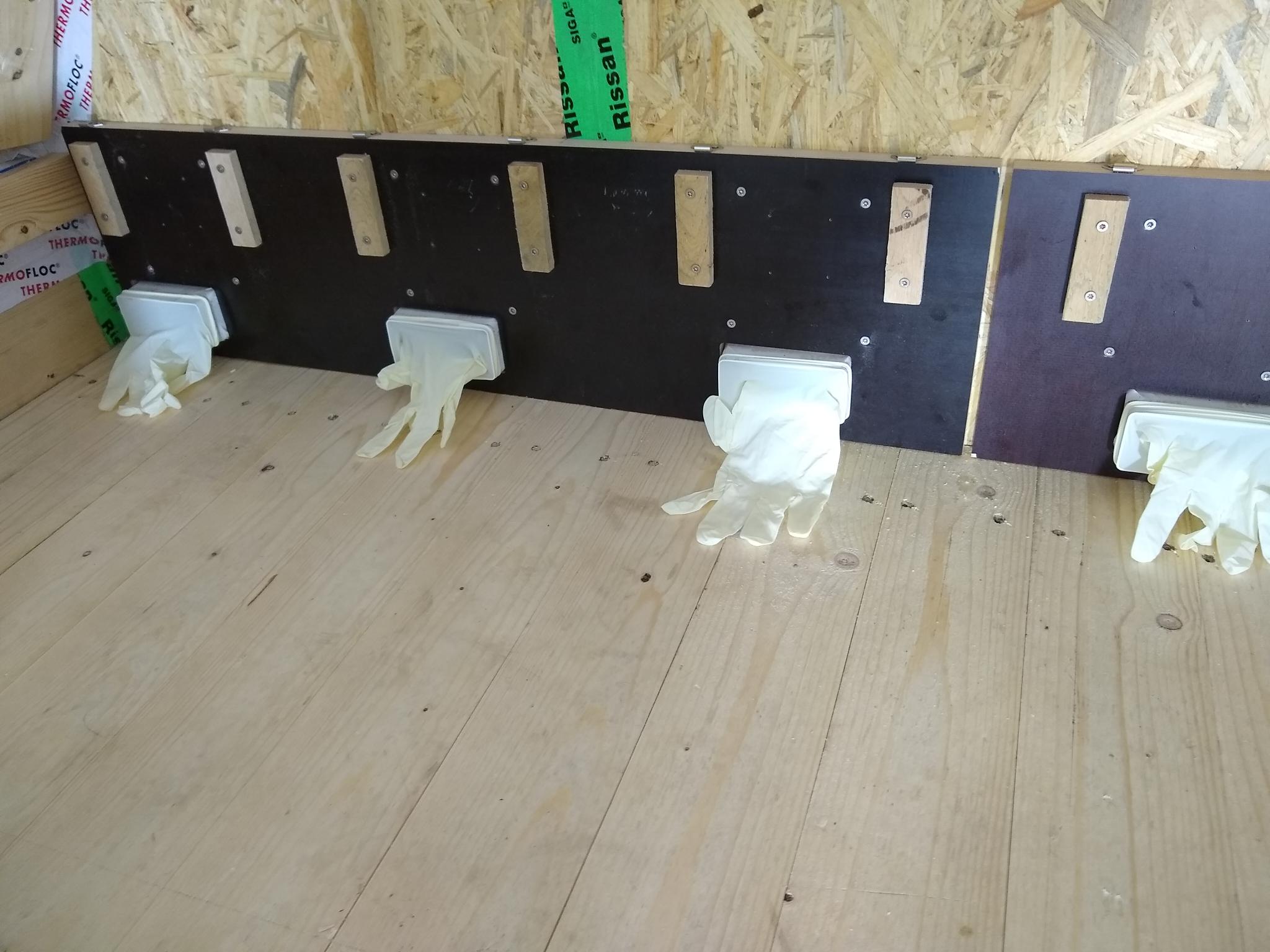 Die Innenansicht vom Giebel kennt Ihr ja schon, rund um die Einfluglöcher hängen jetzt zwei Rückwände mit Löchern für die Tunnel. Die Kästen sind hinten offen und werden einfach auf die zwei kleinen Leisten geschoben und oben mit zwei Klemmverschlüssen festgemacht. Sitzt bombenfest. Für Kameras ist auch schon alles vorgesehen.