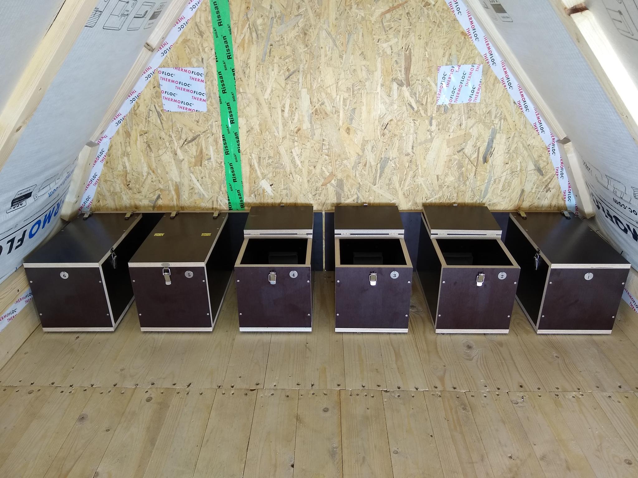 Ein Update von unserem Giebel-Projekt: In den letzten Wochen habe ich mich um die Fertigstellung der Nistkästen gekümmert, die innen vor die sechs Fluglöcher kommen. Gebaut habe ich sie aus Siebdruckplatten, innen rauh und außen glatt. Die Kästen haben ein Innenmaß von L 40 x B 28 x H 30 cm, am Ende haben sie eine kleine Vertiefung für die Nistmulde mit Durchmesser 9 cm. Dafür musste ein Forstnerbohrer herhalten, aber ich muss sagen Siebdruckplatten sind verdammt hart