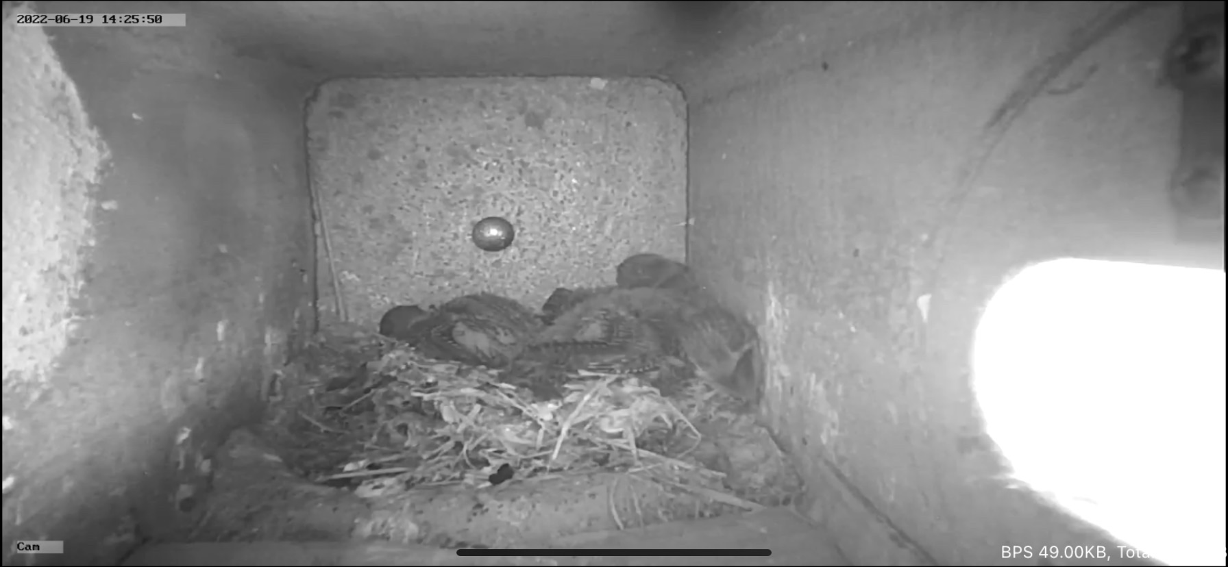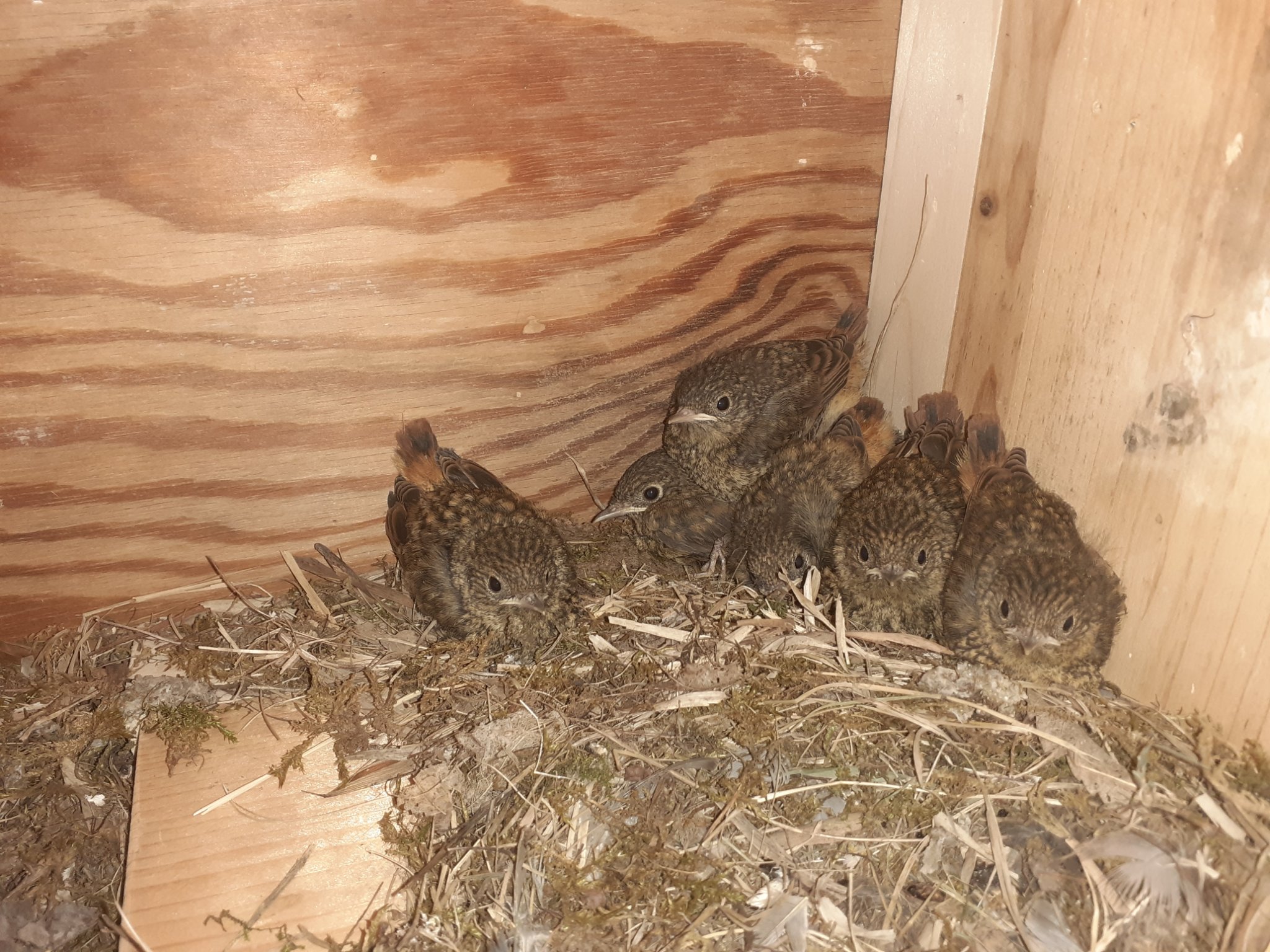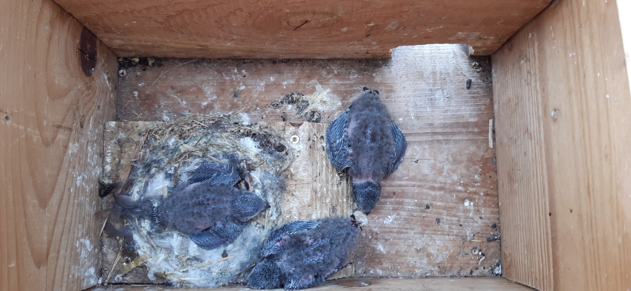 . Ob es selbst reingerobbt oder reingeholt wurde, habe ich verpasst. Die Kästen werden mit Wasser besprüht und alle 2 Std. die Kühlakkus vom Nistkastendach ausgetauscht, die Küken machen einen recht entspannten Eindruck, obwohl unter der (schattigen) Dachverschalung gut 38 Grad Hitze herrschen, da sich die heiße Luft dort staut