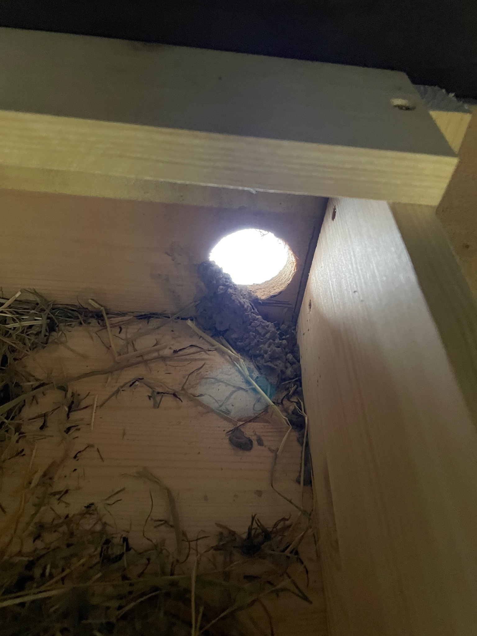Als ihr den ersten Kasten ,vom Dachboden aus erreichbar öffneten ,konnten wir feststellen ,dass das Einflugloch durch Lehmklümpchen verkleinert wurde.