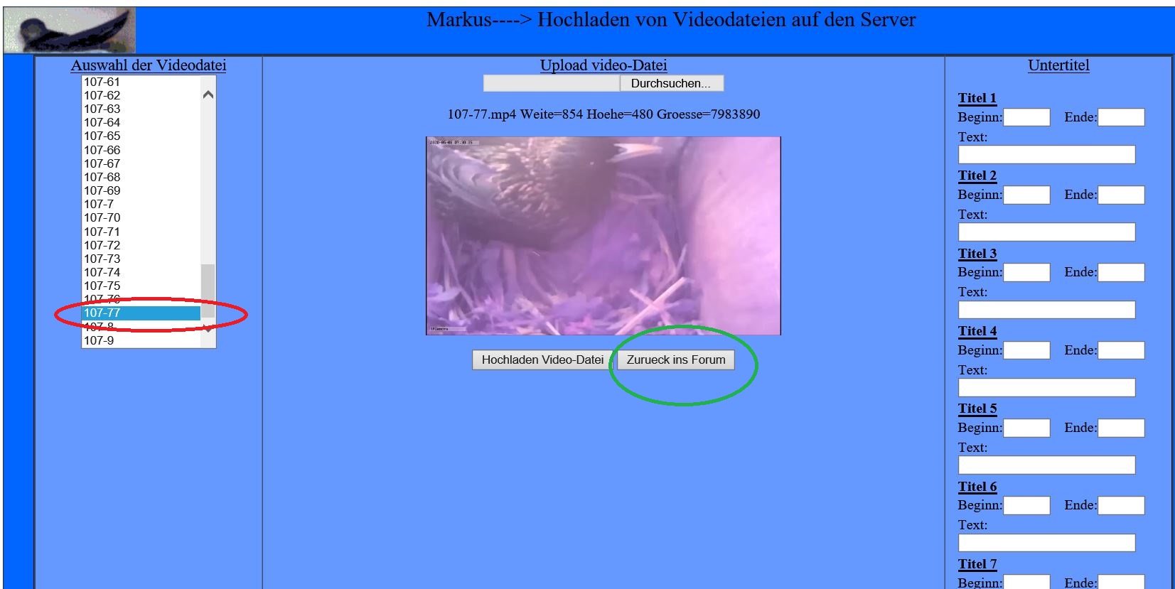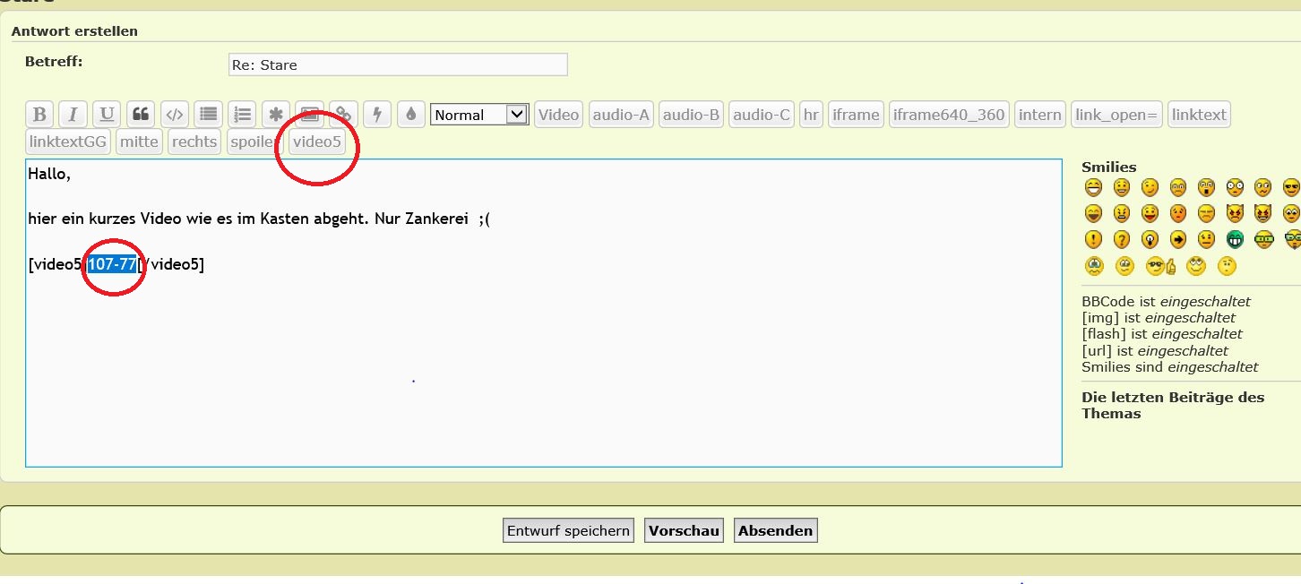Ihr müsst Euch also nur die Nummer der Videodatei merken. In meinem Fall hier also 107-77 --> Markieren---> bbcode (video5) und fertig.