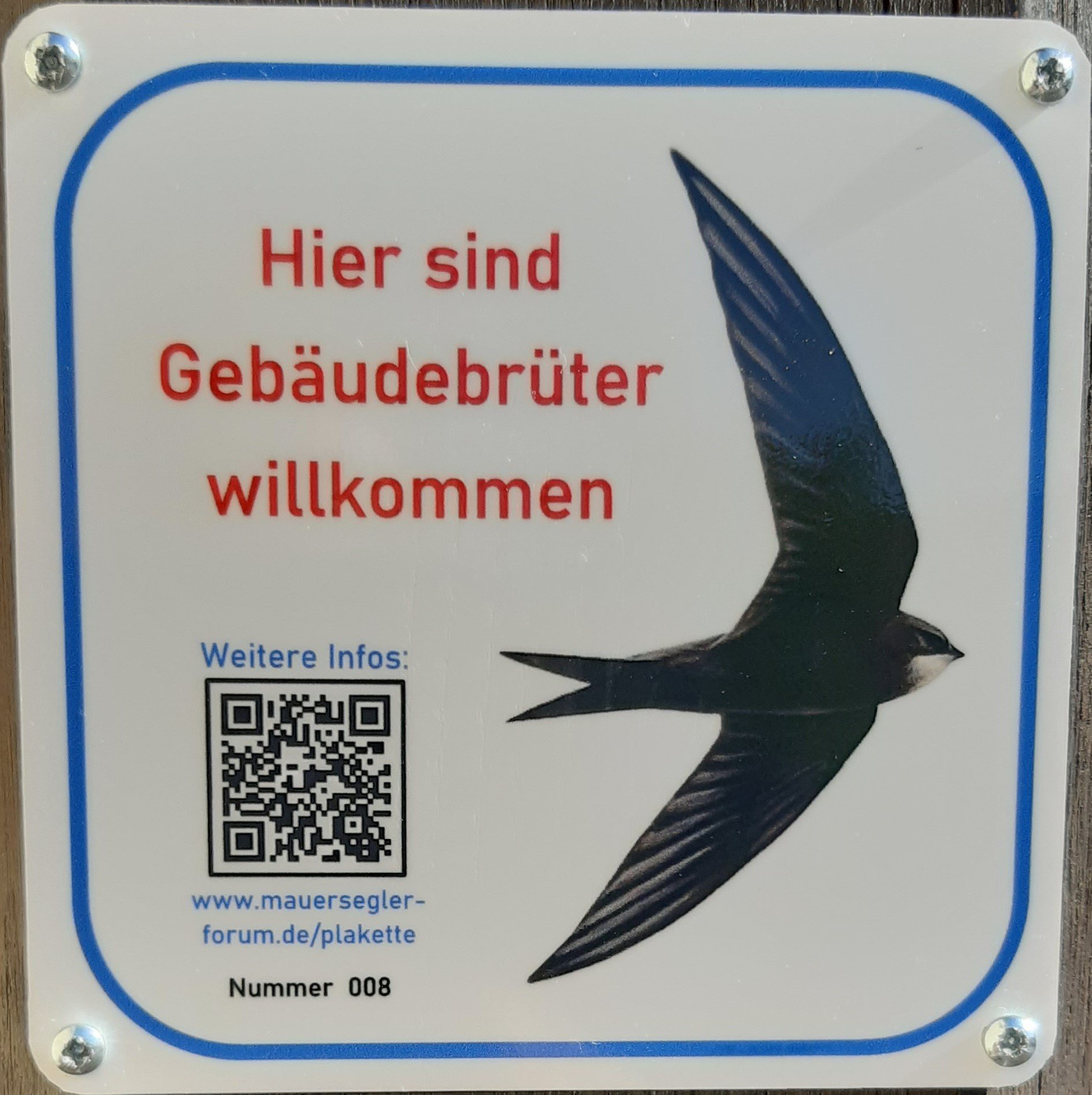 Die Plaketten (zusammen mit "unserer" Plakette wirbt auch die Plakette vom NABU für den Schutz der Gebäudebrüter) befinden sich an einer Straße, an der relativ viele Passanten vorbei kommen. Mehlschwalben sind bisher in drei von sechs Kunstnestern eingezogen, zwei Mauerseglerkästen (alles seit 2022).