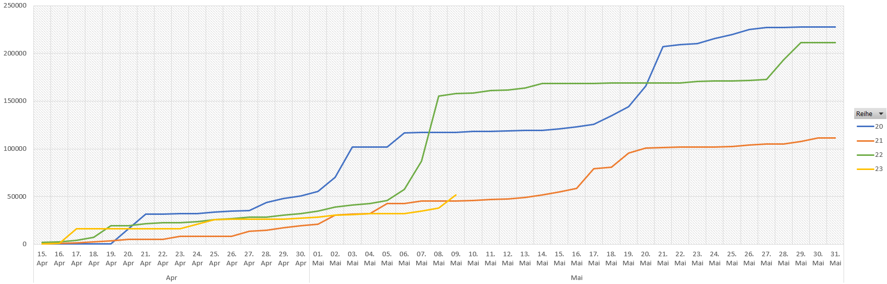 Vergleicht man auf trektellen.org die Meldungen ziehender Mauersegler in Leucate (Mittelmeerküste Südfrankreich) fällt auf, dass sonst etwa ab Mitte April die erste Welle Mauersegler durchzog und etwa vom 01.-07. Mai die zweite, größere. In diesem Jahr ist die erste Welle etwa vier Tage früher aufgetreten als sonst, und sie war nicht besonders groß. Seitdem keine nennenswerten Meldungen. Die zweite Welle blieb bis jetzt aus, aber heute zum ersten Mal wieder eine "größere" Meldung von 13.585 Tieren. Wenn es gut läuft, ist das vielleicht der Beginn der zweiten (verspäteten) Welle die hoffentlich dafür mehr Individuen enthält als sonst.