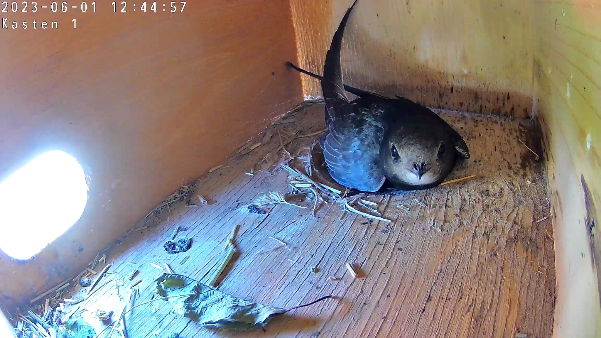 Gegen 22 Uhr kamen sie zurück. Einer flog ein schaute sich um und verließ den Kasten. Dann haben sie den Anflug bestimmt 20 x geübt. Kurz bis zur Hälfte rein und dann wieder raus.