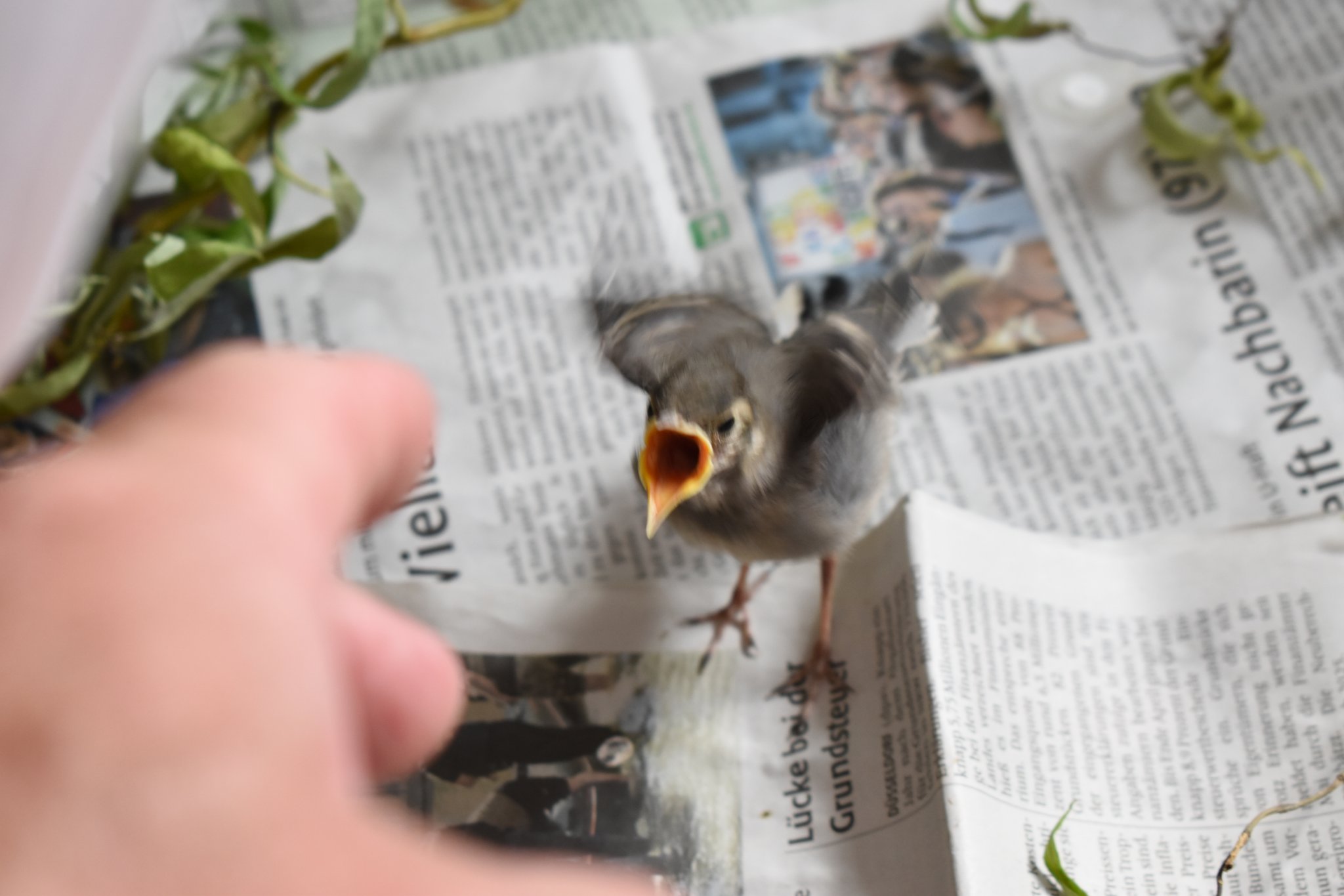 Sie wachsen und gedeihen - und fressen! Zwei Tage nach Ankunft haben sie ihr Nest verlassen und sind erst mal in einen größeren Käfig umgezogen. Auffällig, aber für Rotkehlchen wohl normal: sie halten sich gern versteckt auf. Eine Seite des Käfigs war zum Schutz vor Sonne mit einem Handtuch abgehängt. Sie hielten sich vorwiegend dort auf, auch, wenn die Sonne mal nicht schien. Seit gestern sind sie in ein größeres Appartment umgezogen. Im Moskitonetz können sie sich natürlicher bewegen und auch das Fliegen und Fliegenfangen üben. Auch hier lieben sie die Deckung. Inzwischen fangen sie an, sich für bewegliches Futter zu interessieren. So hat eins heute morgen selbständig eine Wachsmotte erbeutet. Für Futter kommen sie aber noch aus der Deckung, wenn sie auch erwarten, dass die fütternde Person ihnen entgegenkommt. Inzwischen haben meine Frau und Tochter ihnen wohlklingende Namen verliehen. sie werden aber nach Rotkehlchen-Art wohl nie darauf hören. Auf die Stimme meiner Frau und /oder einen leisen Pfiff antworten sie aber sofort laut und deutlich mit Bettelrufen. Noch eins: die Aufzucht kann man wohl nicht so nebenbei leisten. Grillen- und Wachsmottenzucht geraten an ihre Grenzen. In unserem Fall sind da bis zu vier Personen im Einsatz, um die Fütterungsintervalle einigermaßen zu gewährleisten. Aber es ist auch sehr schön, ihnen beim Wachsen Gesellschaft leisten zu dürfen Fortsetzung folgt, wenn's was Neues gibt.