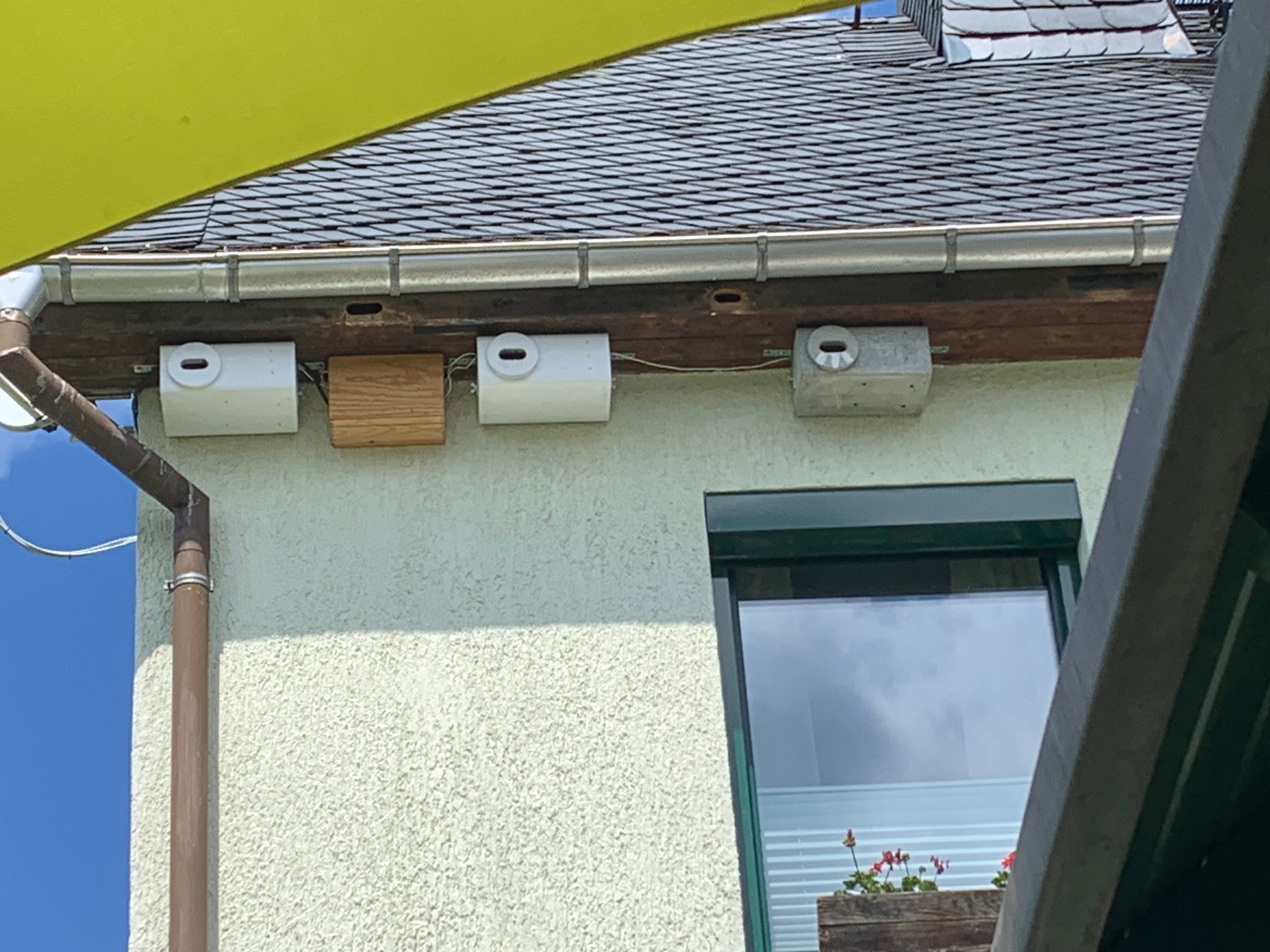 Apropos weitere Begeisterte: Wir hatten gestern - wie auch in einen anderen Thread schon geschrieben - nachdem ich den 3er Kasten am Westgiebel geöffnet und die Lockrufe aktiviert hatte, einen massiven Ansturm von 10 bis 15 MS. Auffällig dabei war, dass keine Anhänge am Kasten oder den Einflügen selbst gab, sondern darunter und sehr viele darüber in der Spitze (siehe Bild). Ich habe schon oft festgestellt, dass die MS bei mir ums Haus nur nach natürlichen Einflügen suchen und die Einflüge und an- oder aufgesetzte Kästen einfach nicht finden. Deutlich wurde dies auch, dass zu meiner Verwunderung auch an der Nordseite an der Traufe unter der Dachrinne über den Mehlschwalbennestern angeflogen und auch oft angehangen wurde. Meine Frau meinte :shock: : Warum machst Du da nicht einfach Einflüge in die Traufe wie auf der Südseite :mrgreen: und einfach mal keine Kästen :lol: ... gleiches meinte sie zur Spitze des Westgiebels :mrgreen: