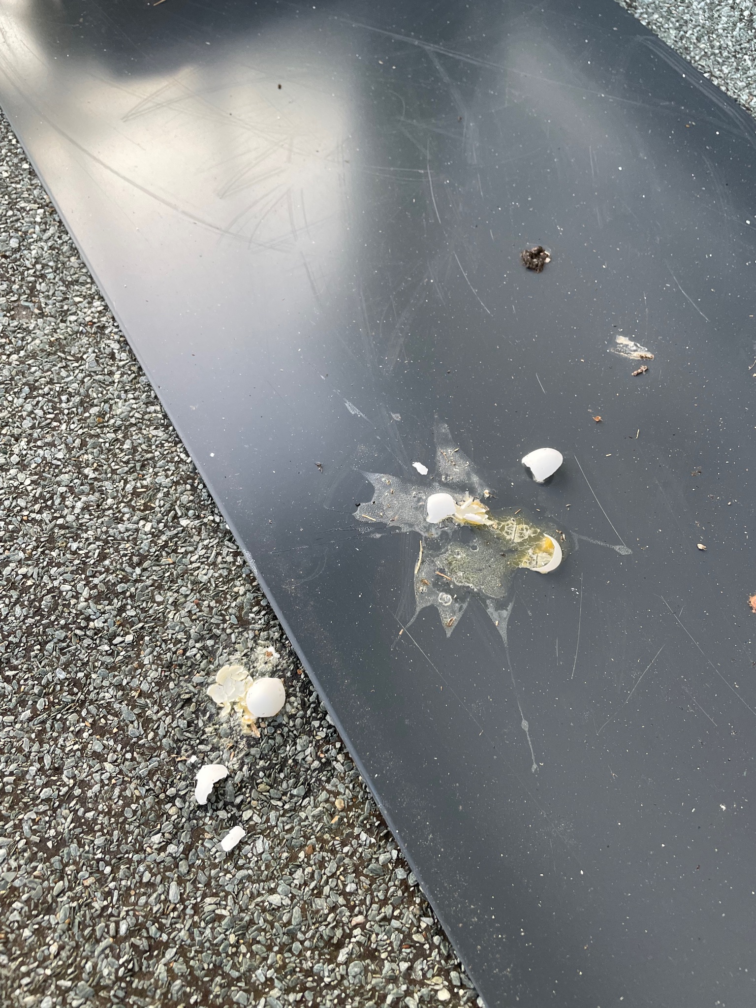 Es kommt tatsächlich öfter vor als du denkst,das der frischgeschlüpfte Jungvogel wie Calimero noch die Eischale am Kopf kleben hat und somit versehentlich entsorgt wird.Auch das ein Küken beim Ausflug der Eltern mal mit aus dem Ausgang fällt.