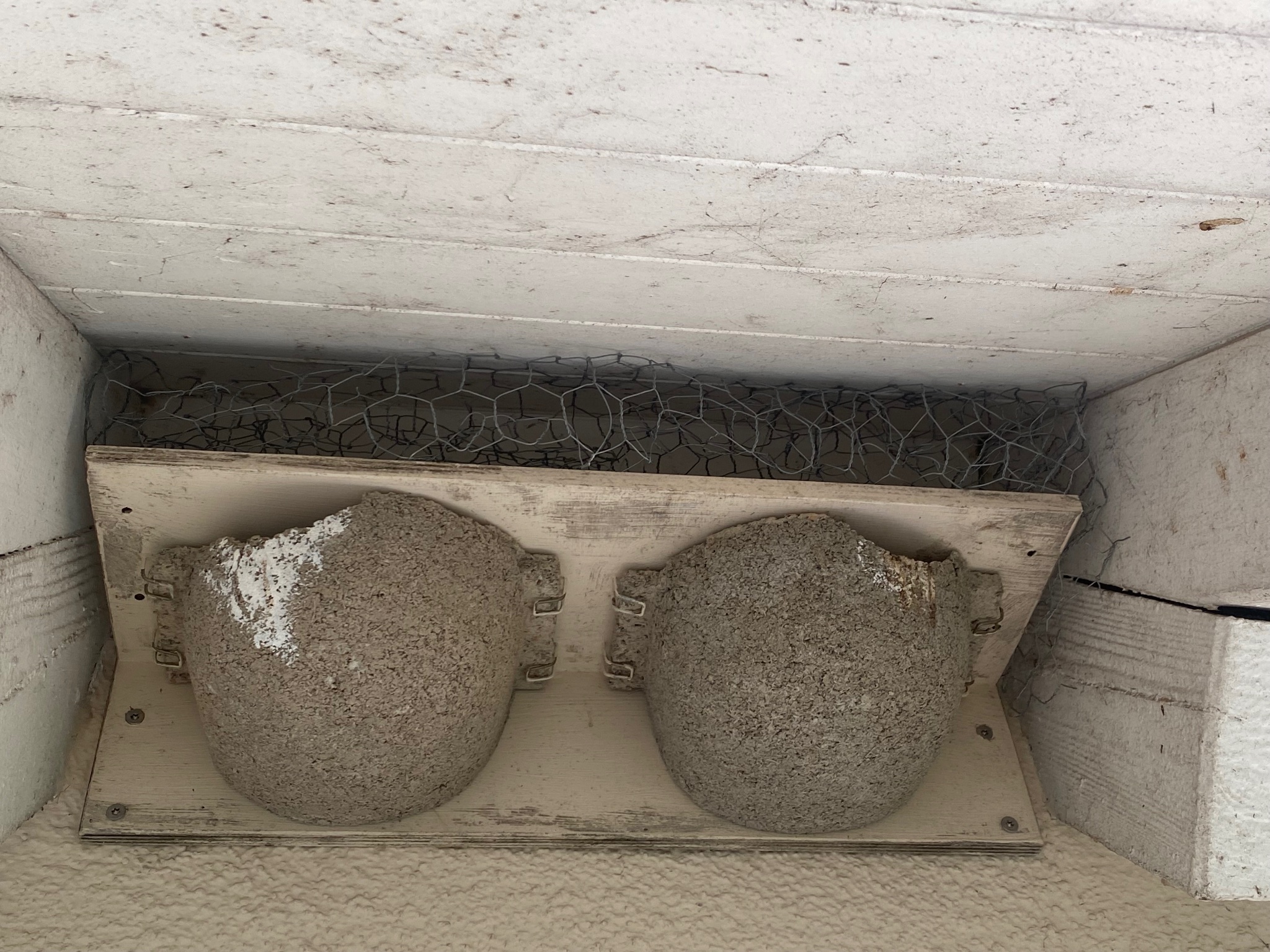 Also ein Brett zwischen Dach und Mehlschwalben-Nisthilfe und in die Mitte zwischen die beiden Mehlschwalben-Nester eine Mauersegler-Öffnung :D