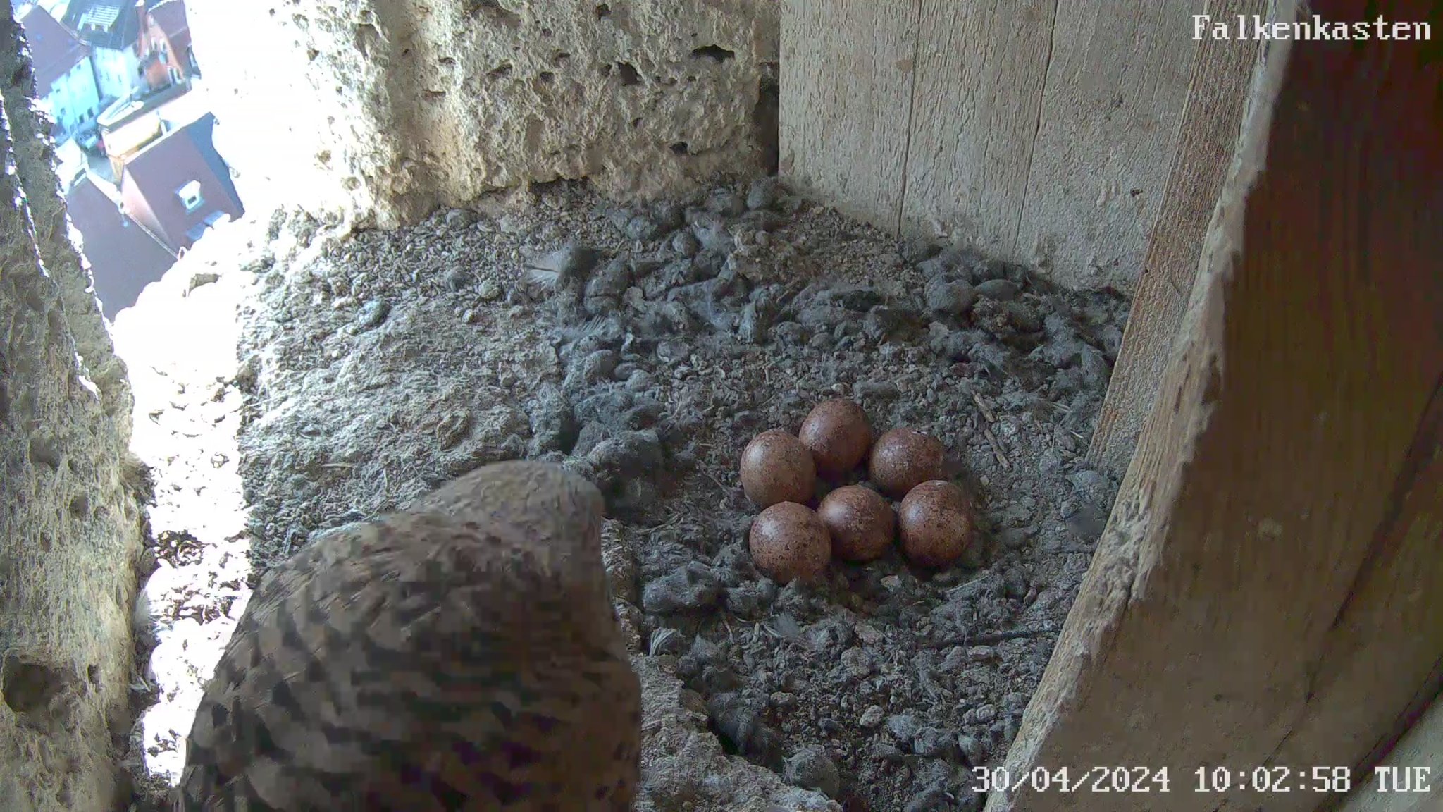 Dodo hat geschrieben: Di 30. Apr 2024, 16:53 Bei mir war heute das erste Ei im Kasten zu sehen. Der Turmfalken Papa begutachtet das Ei und nimmt kurz Platz.