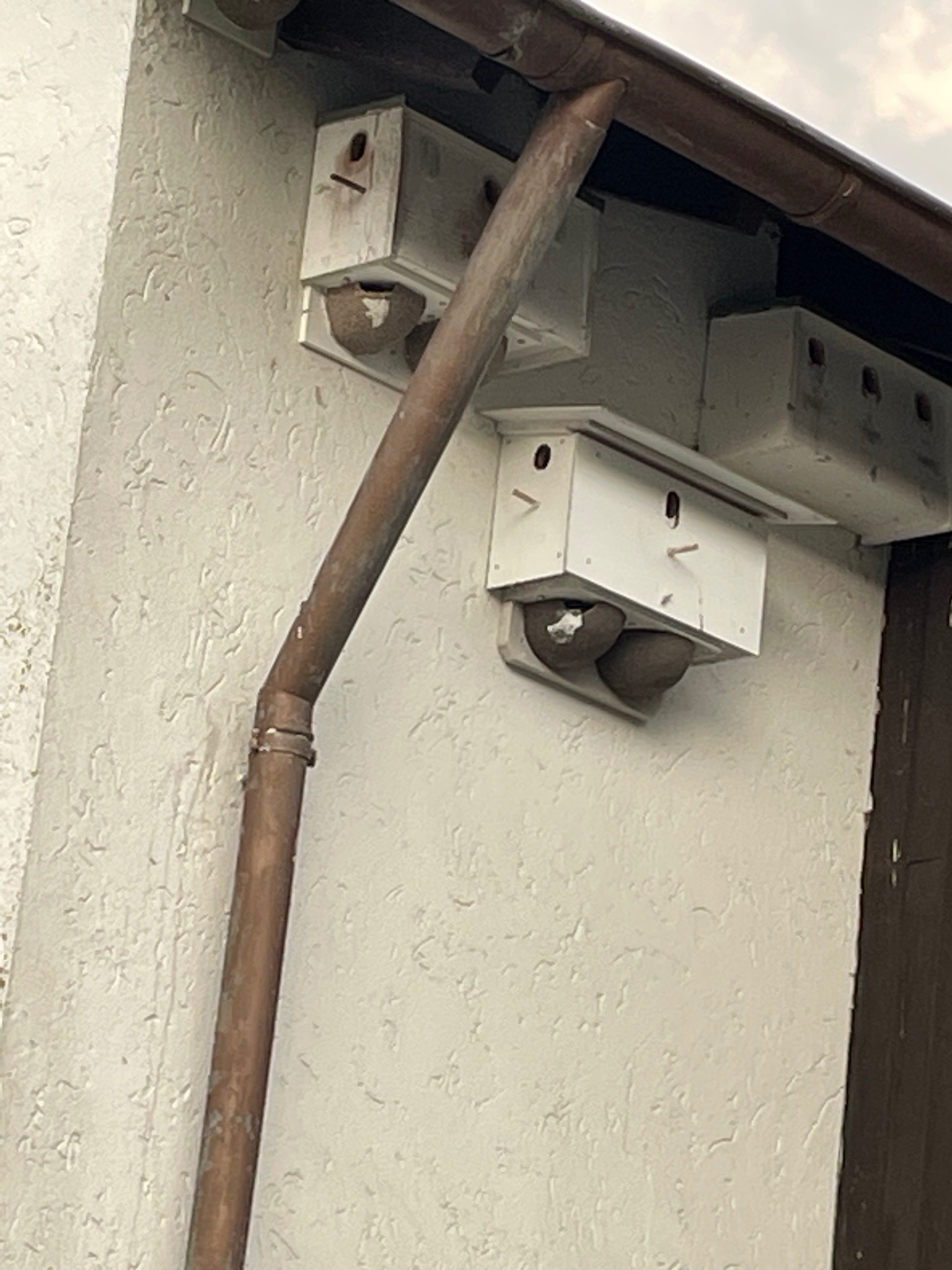 gestern Abend hatte ich spontan mein Angebot an Mehlschwalbenkunstnestern an der Hausecke Richtung Norden erweitert.Unter dem unteren Sperlingskasten hatte ich das Doppelnest angeschraubt und konnte , als ich heute früh um sechs zur Arbeit fuhr, zu meiner Freude / Erstaunen schon zwei Mehlschwalbenköpfe im linken Nest erkennen