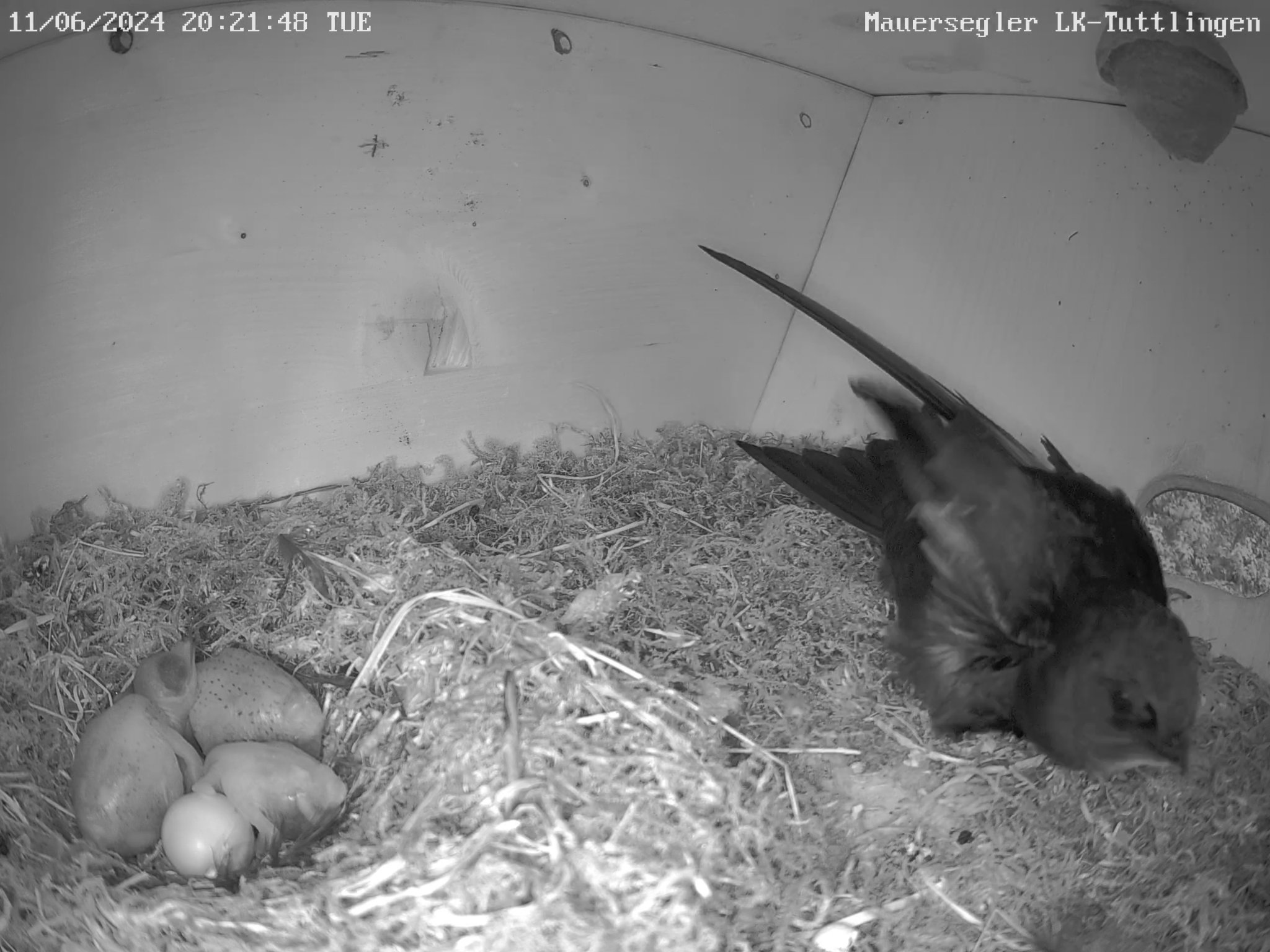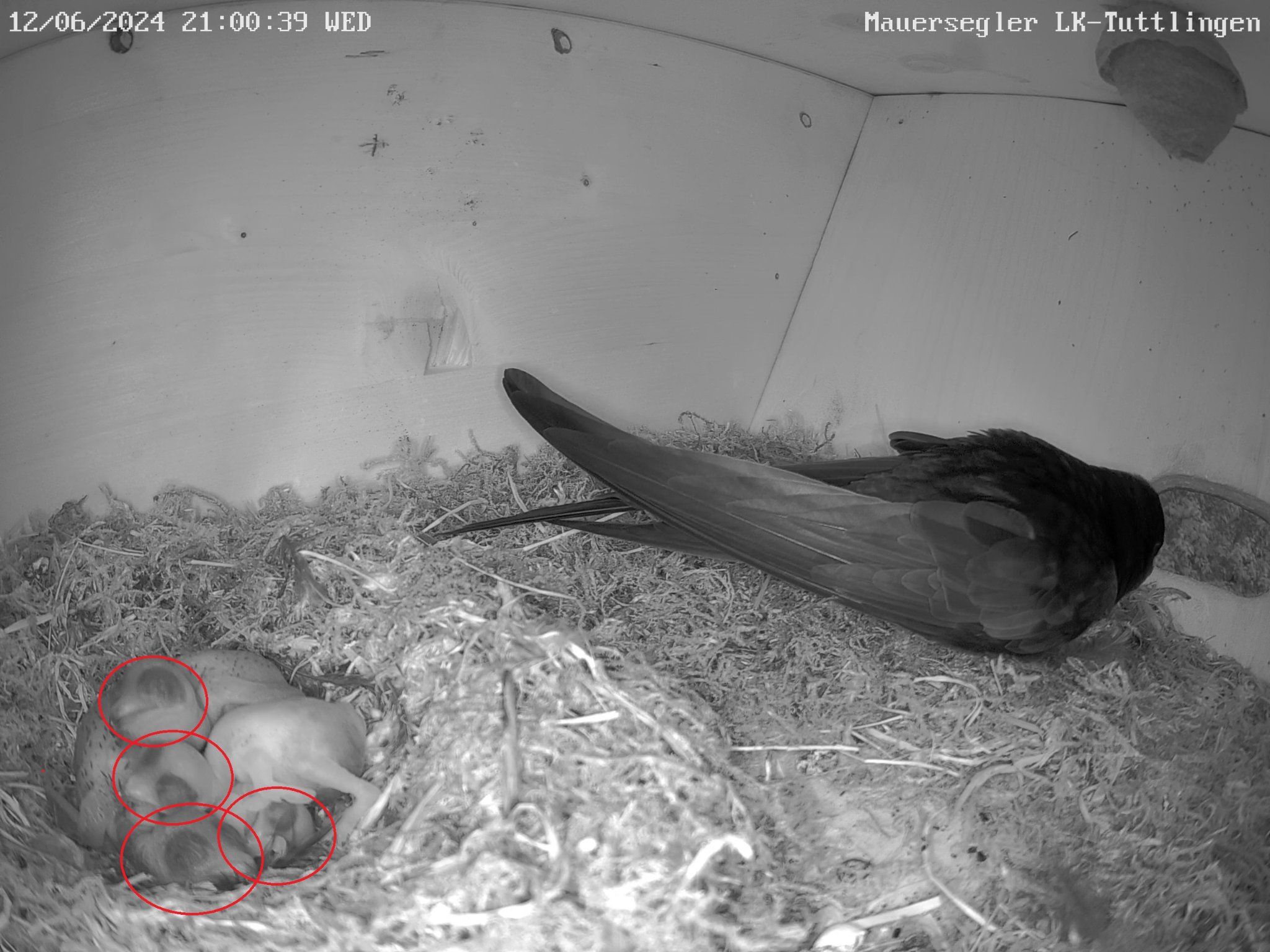 Heute morgen sah ich den kleinen einmal unter seine Geschwister kriechen. In der Betrachtung der Aufnahmen von heute sieht man gegen 13:00 Uhr seinen Kopf, er scheint auf dem Rücken zu liegen. Der AV scheint die Stelle nach der Fütterung der drei Geschwister genau zu untersuchen, wirkt aufgeregt. Danach konnte ich den JV nicht mehr sehen. Den drei größeren scheint es gut zu gehen, wobei sie auch sicher etwas mehr Futter gebrauchen könnten. Sie werden bereits über längere Zeit allein gelassen.