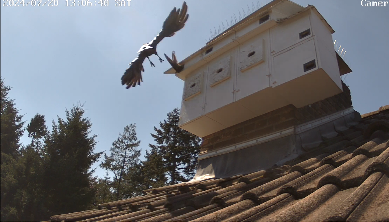 Der Segler hing erst ein paar Sekunden am Einflug, als aus dem Nichts schon der schwarze Schatten da war. Glücklicherweise habe ich reflexartig reagiert, geschrien, geklatscht und mit den Armen gerudert was die Krähe etwas irritiert hat und vom direkten Zufassen abgehalten hat. Trotzdem drehte sie sich in der Luft und wollte sofort wieder angreifen worauf ich meine Aktivität und Lautstärke steigerte was die Krähe dann zum Abdrehen veranlasste. Das hat mir die Sekunden verschafft, auf den Dachboden zu sprinten. Als mein Konterfei aus dem Dachfenster auftauchte, war die Krähe ausreichend verschreckt und verzog sich.