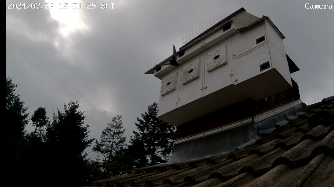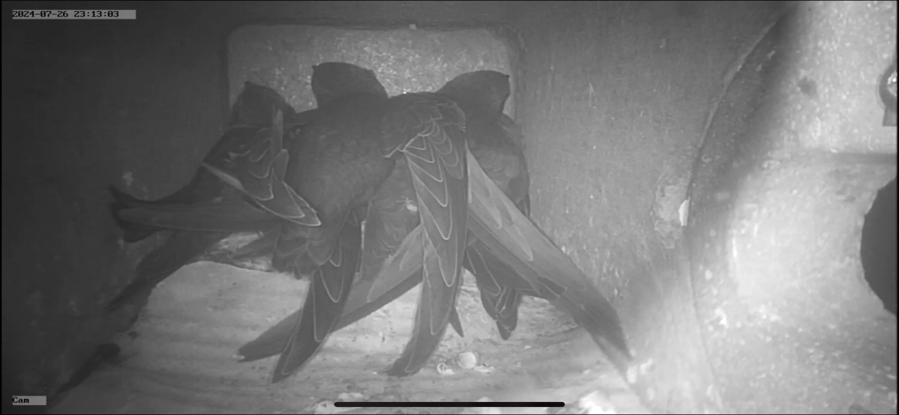 Am Montag, 15/7 gegen 8.55 gab es dort zwei Jungsegler Ausflüge. Zwei Geschwister stürzten sich ohne Zögern innerhalb ca. einer Sekunde hintereinander aus dem Kasten direkt in ein großes Screaming und Sucherspektakel, das gerade stattfand. Zügig waren sie am Himmel verschwunden. Das hatte ich bisher so noch nicht erlebt. Tagsüber schauen sie hier zwar niemals direkt aus den Einflügen sondern vermutlich von weiter hinten wegen der Prädatorengefahr, aber so einen explosiven Ausflug zweier Geschwister hatte ich noch nicht erlebt.