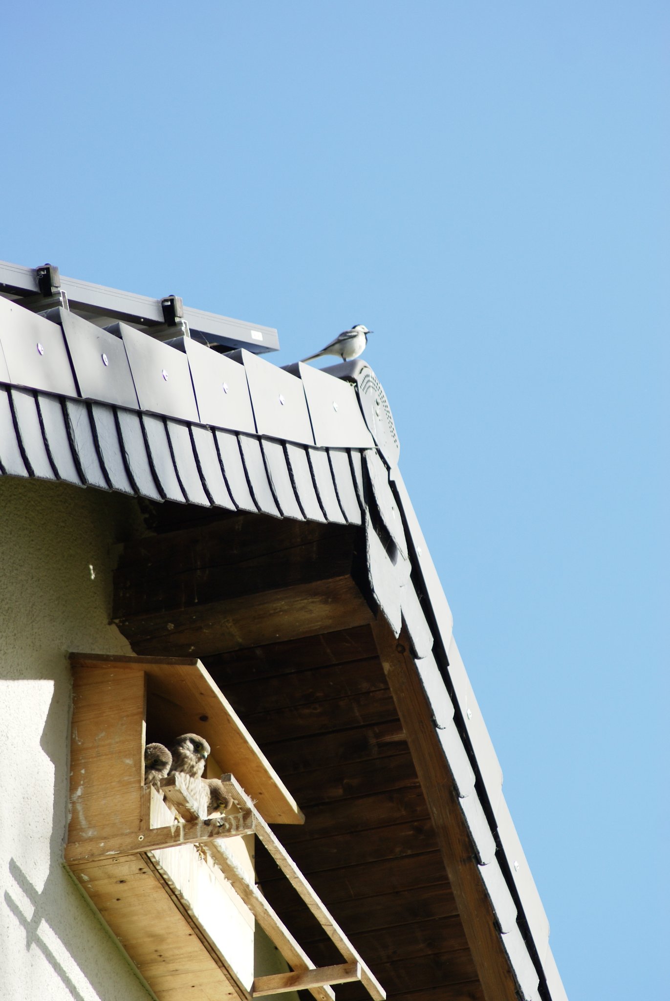 in dem giebel in dem der turmfalkenkasten sind keine anderen einflüge bzw nester, alle vögel sind grundsätzlich auf der hut gewesen und haben immer kontrolliert richtung kasten geschaut wenn sie darunter agiert haben, waren sie oberhalb haben sie sich quasi nie eingeschränkt, die bachstelze wie auf den fotos zu sehen ist nur ein beispiel.