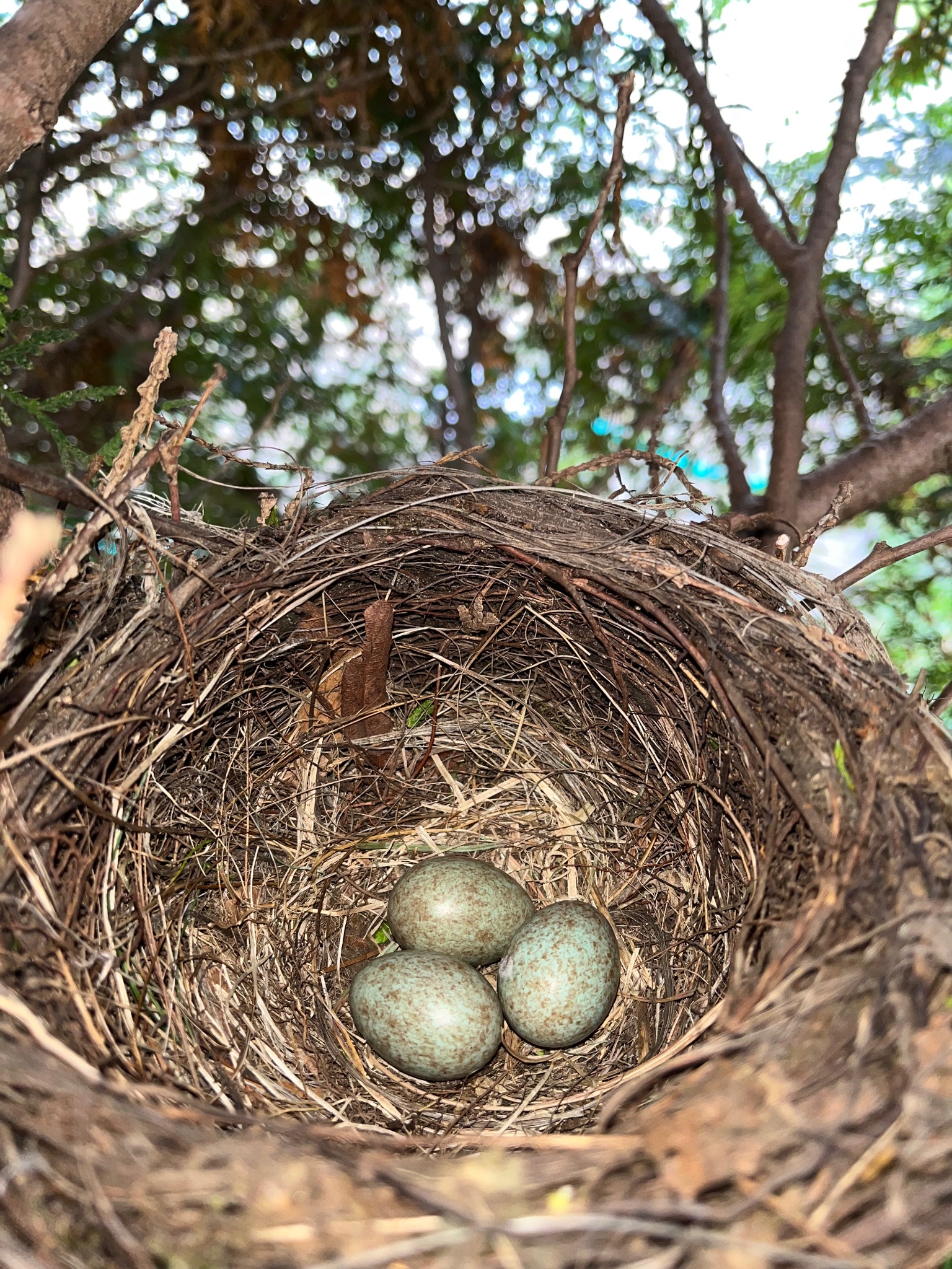 Inzwischen ist die zweite Brut einem Eierdieb zum Opfer gefallen. Die dritte Brut versuchen sie gerade auf dem Jalousie-Kasten am Balkon, wo sie eine etwas bessere Chance haben dürften.
