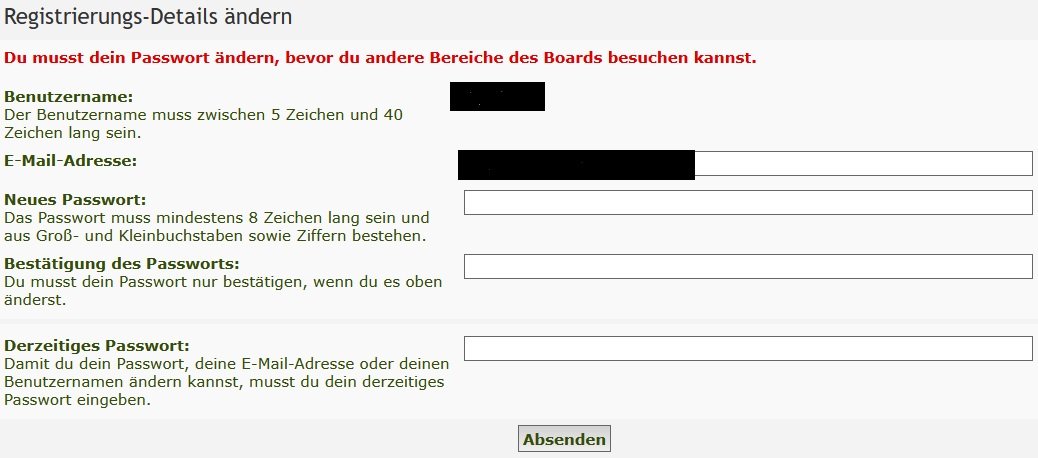 Wichtig ist es auch, seine Passwörter ab und zu einmal zu wechseln. Unsere Forensoftware hat hierfür eine Erinnerungsfunktion, diese habe ich aufgrund der zunehmenden Hacking-Aktivitäten jetzt aktiviert. Einmal jährlich (ich denke, damit kann jeder leben) muss nun das eigene Passwort neu vergeben werden. Beim Login wird man jetzt automatisch daran erinnert: Ist das Passwort älter als ein Jahr, muss ein neues vergeben werden (zweimal das neue Passwort eingeben, einmal das alte). Ein sicheres Passwort enthält Groß- und Kleinbuchstaben, Zahlen und Sonderzeichen.