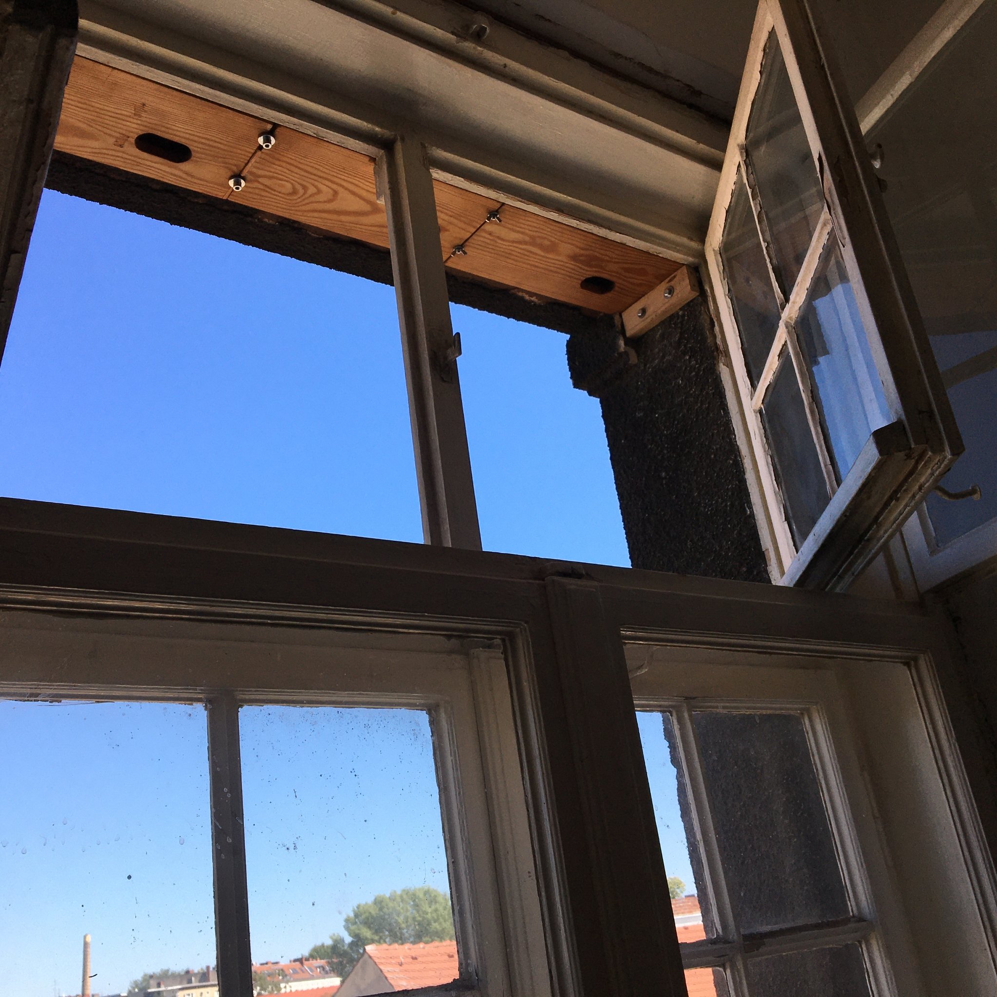 Ich habe vor ein paar Monaten einen Nistkasten in eine Fensternische eingepasst. Dort war vormals im Altbau über dem Fenster hinter der Fassade eine jalousie eingebaut, die vor Jahrzehnten entfernt worden war.