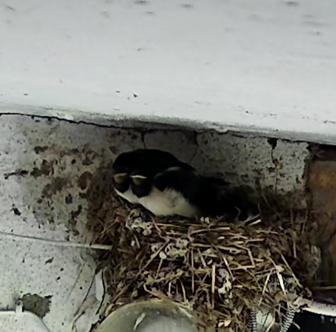 die zweite Brut im Carport ist erfolgreich durchgestartet und auch wie bei Hermine unter Anfeuerungsrufen der Eltern und Geschwister. Es waren also 12 quietschfidele Schalben im Carport verteilt, herrlich. Erstaunlicherweise haben sich gerade alle fünf ins Nest gesetzt (der fünfte liegt quer). Ich frage mich also, ob evtl. ein Unwetter im Anmarsch ist. Mal schauen.