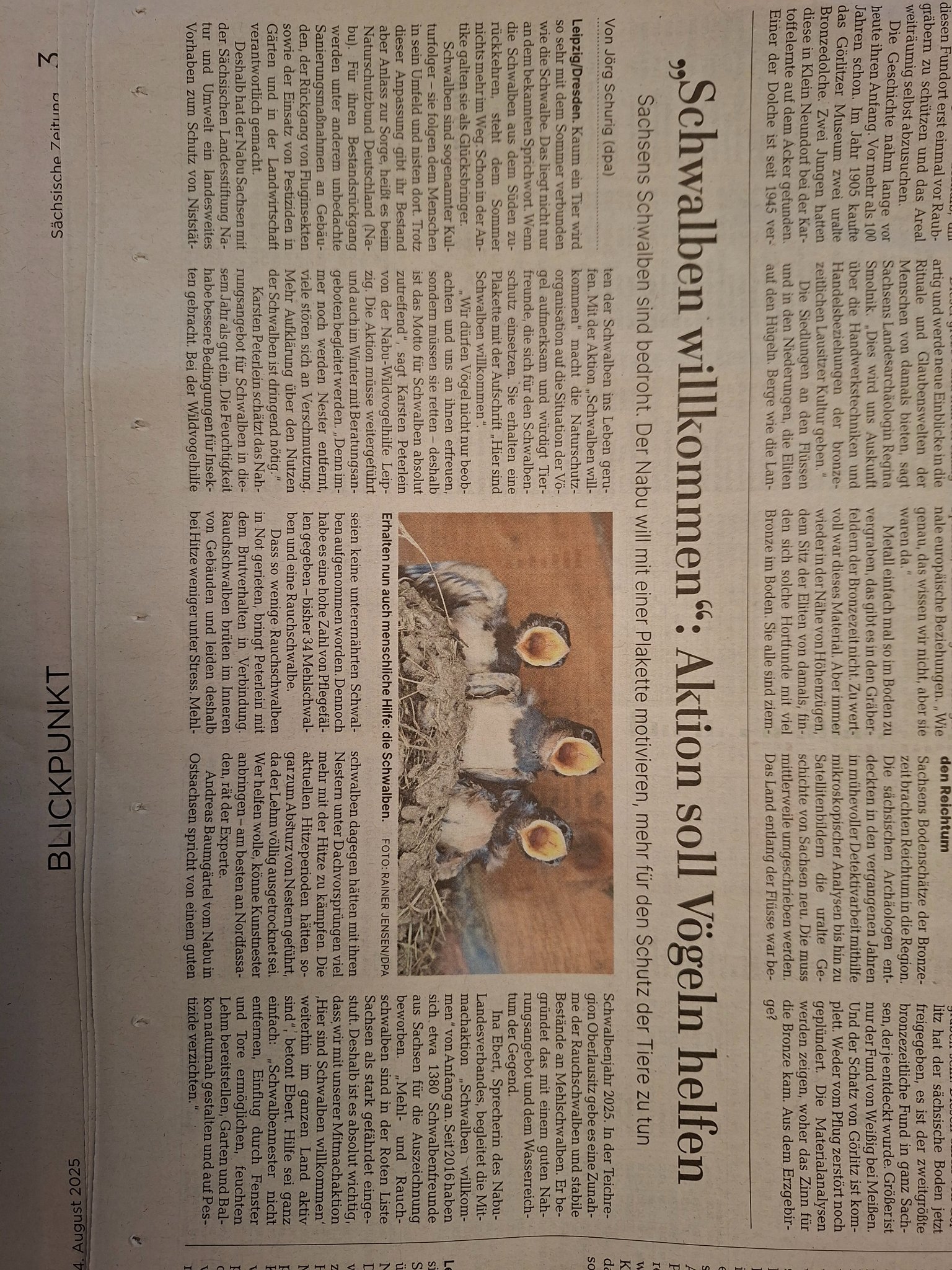 Die „Schwalbenhimmel“ im August sind die Vorboten für die baldige große Reise. Es sind nun auch die meisten Jungvögel der 2. Brut mit ausgeflogen und die Eltern füttern nicht mehr. Das heißt alles was Rang und Namen hat ist in der Luft. Flugtraining, Futtersuche und Spaß in der Gruppe. Zusammen mit den Mehlschwalben kommen da schon ziemlich große Gruppen zusammen. Das mag ich, wenn der Himmel nochmal so richtig voll ist.Schwalbenatze hat geschrieben: Sa 30. Aug 2025, 06:45 …etwa 50(wahrscheinlich waren es mehr) Schwalben am Himmel versammelt hatten. Ein schönes Schauspiel! Leider war ich zu langsam um dieses Schauspiel zu Filmen! Jetzt meine Frage sind das evtl. die ersten Gruppen die sich zum Abflug bereit machen?