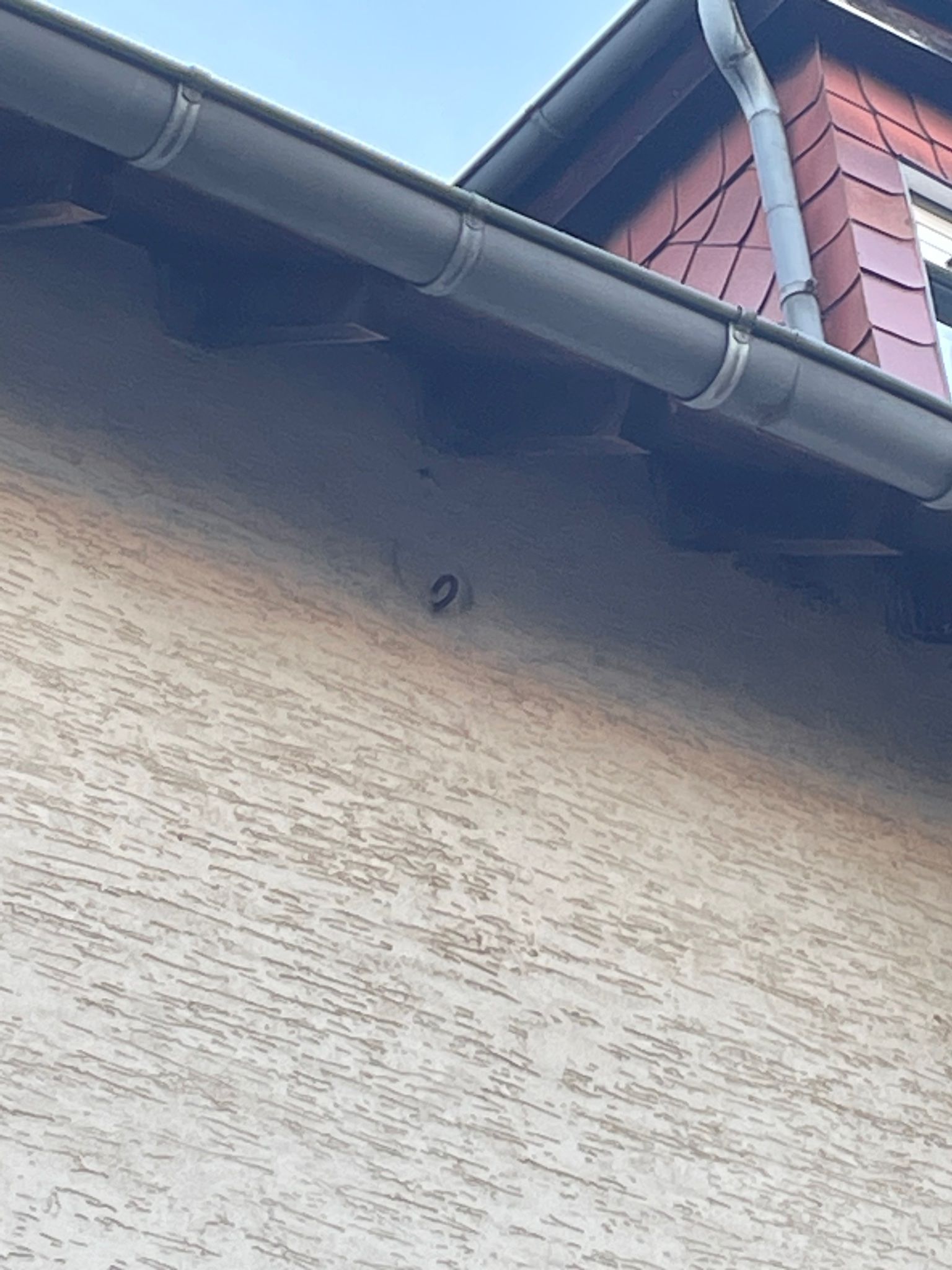 Dem Druck , einen Nistplatz zu finden , war dann sicher auch geschuldet , daß der Abstand von der Nestkante zum Dachüberstand / Sparren doch eher groß ausfiel.