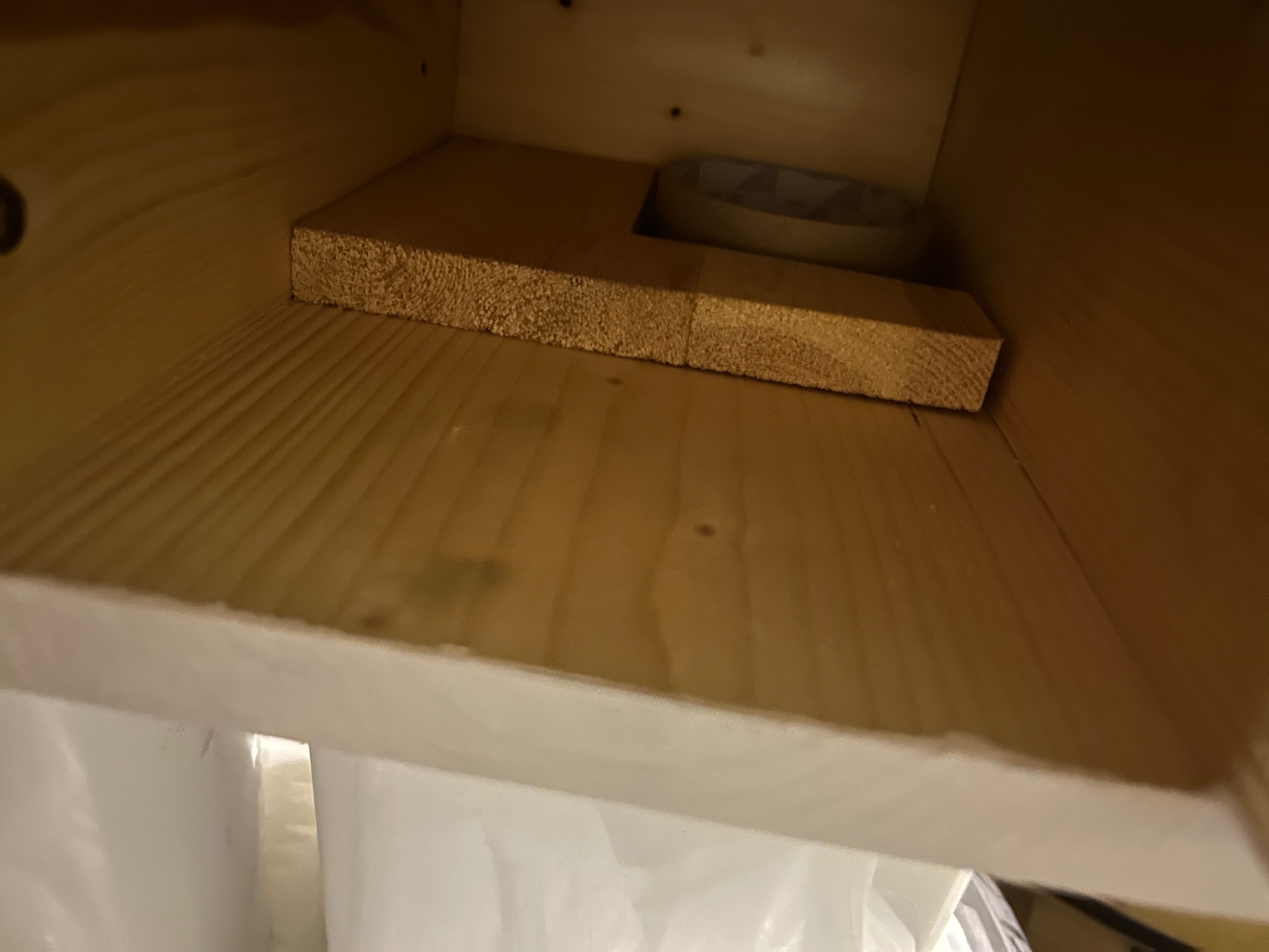 Einmal eine abgeschnittene Rolle vom Klebeband auf einen Korkuntersetzer geklebt und dann in eine Ecke des Kastens geklebt und das andere wieder eine mit der Säge gekürzte Kleberolle auf Kork geklebt aber nur in den Kasten gelegt und zur Stabilisierung und besserer Raumaufteilung ein Brett eingelegt.