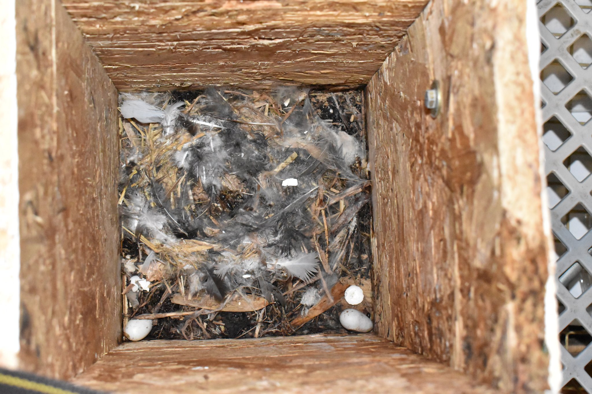 Blick in den Kasten ohne Starennestunterlage. 2 Rolleier, der einzige geschlüpfte JV lag am 2. Tag in der Ecke oben rechts