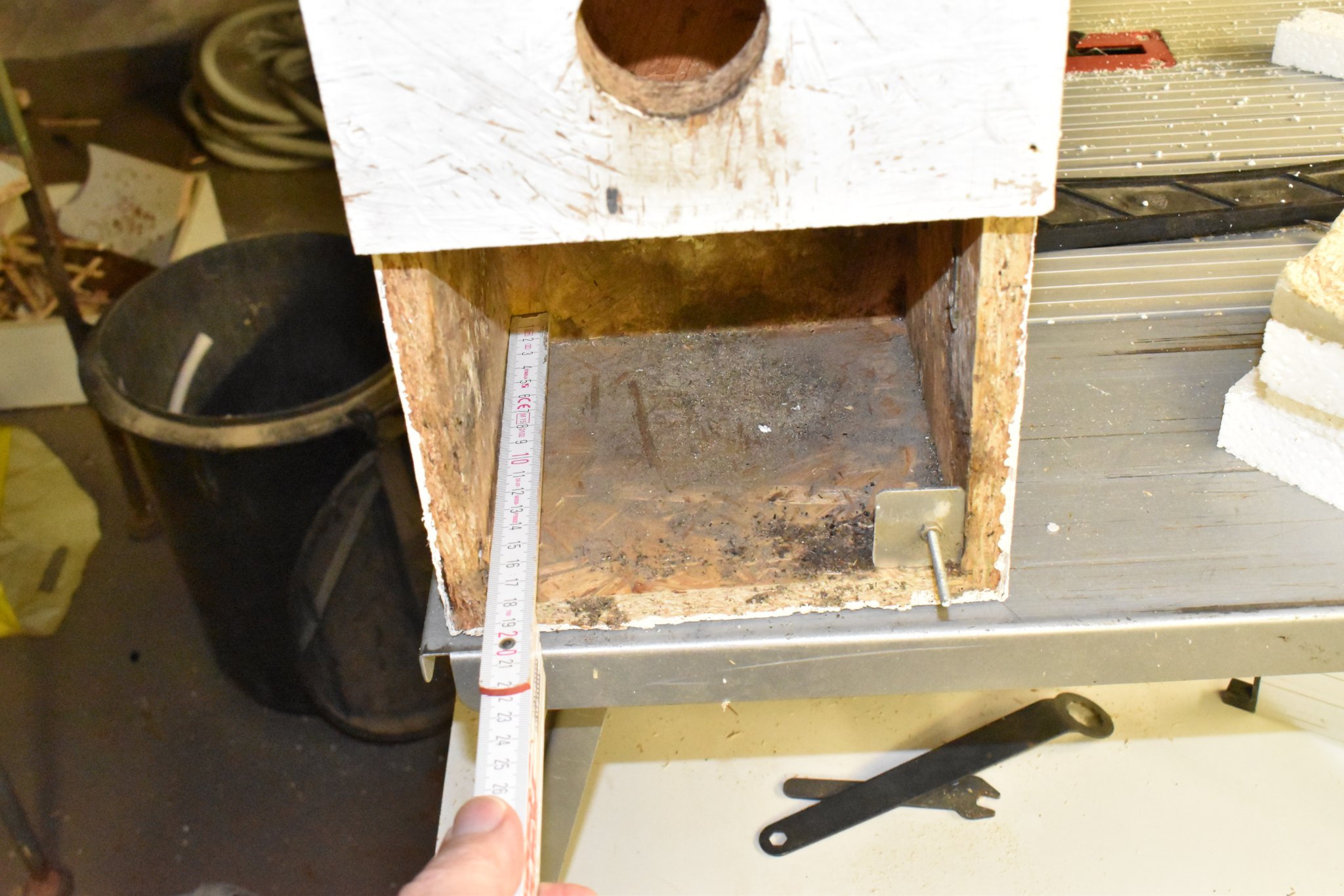 Ausmessen eines Starenkastens, der von vorn geöffnet wird. Die Metallhalterung für die Vorderfront (rechts) wird ausgespart.