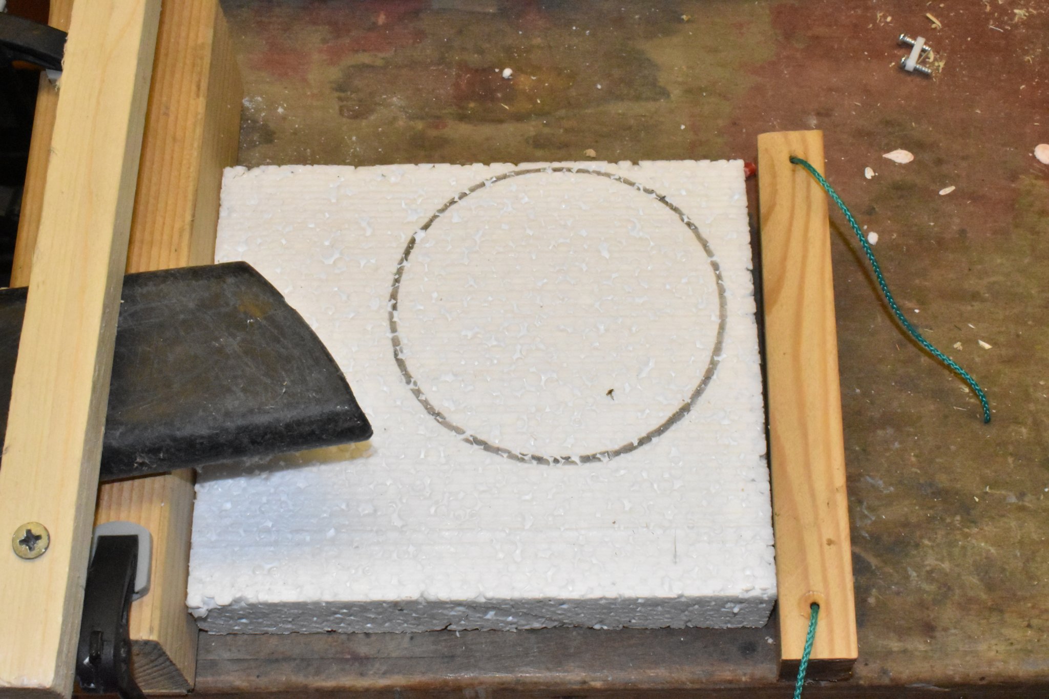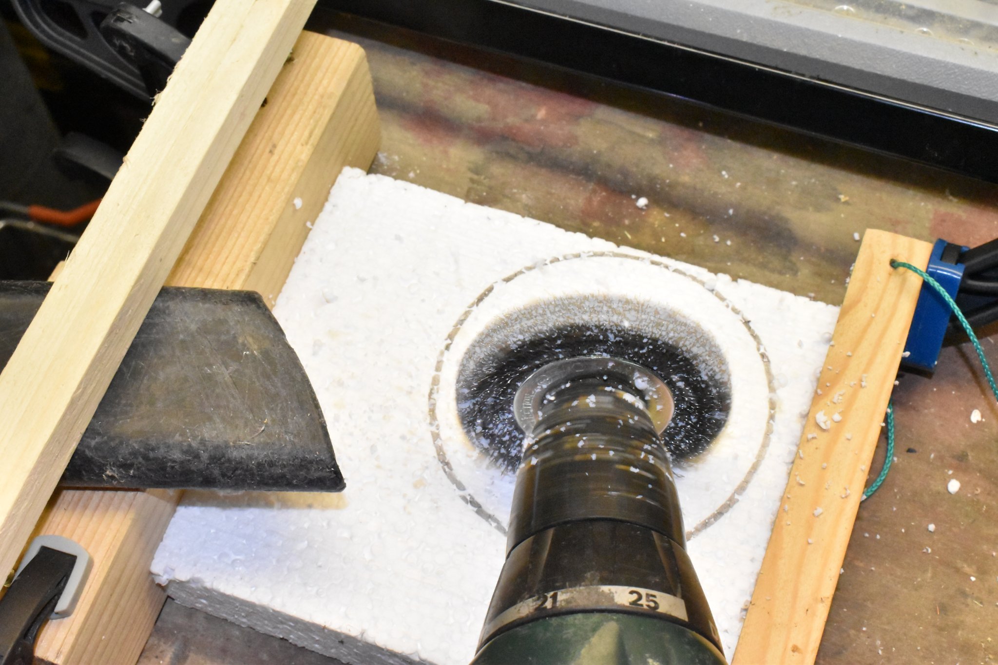 Die Nistmulde wird so eingezeichnet, dass sie später möglichst weit vom Einflug entfernt liegt. Links im Bild die Ansaugdüse eines Staubsaugers, die später die anfallenden Styropor.Flocken aufsaugen wird