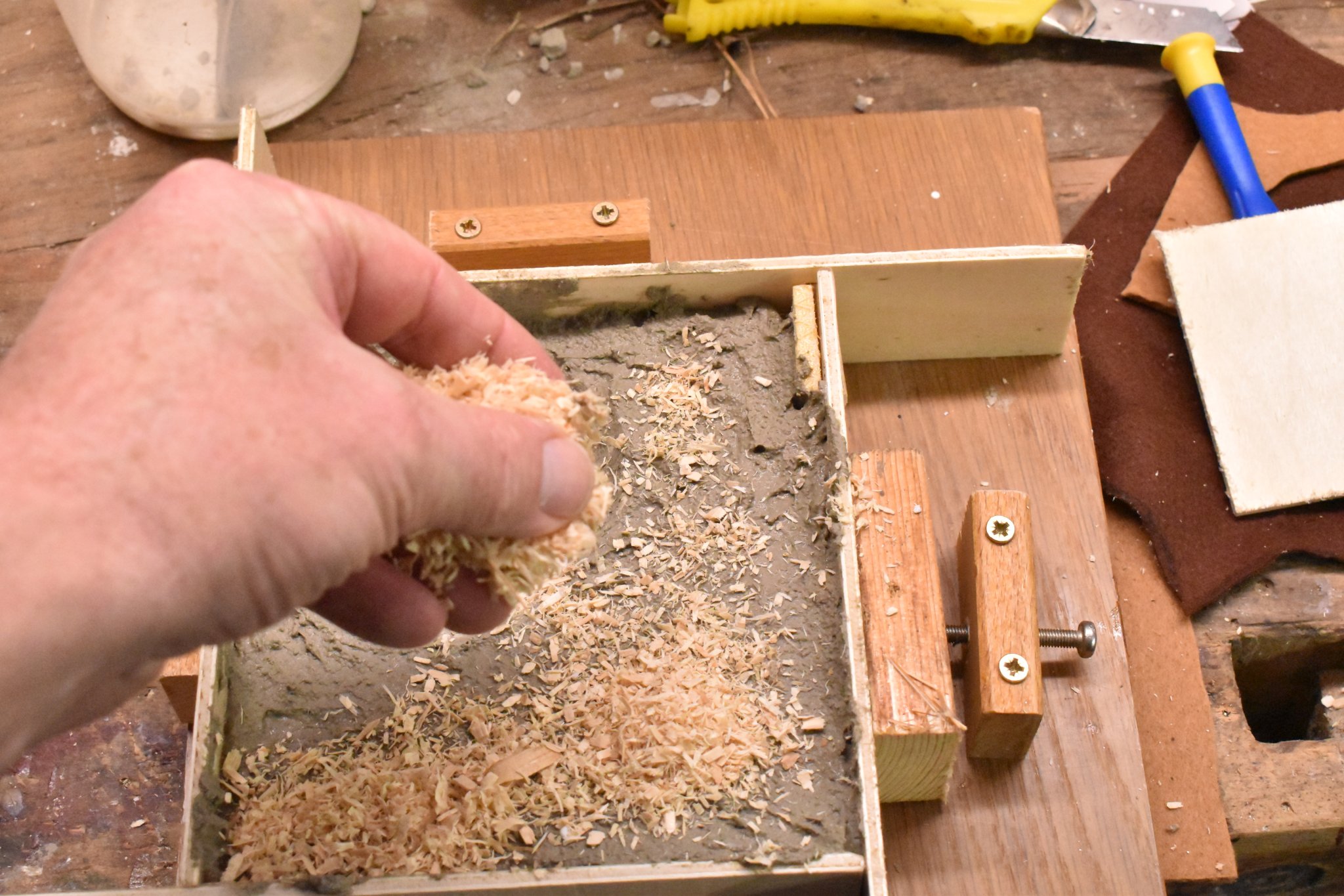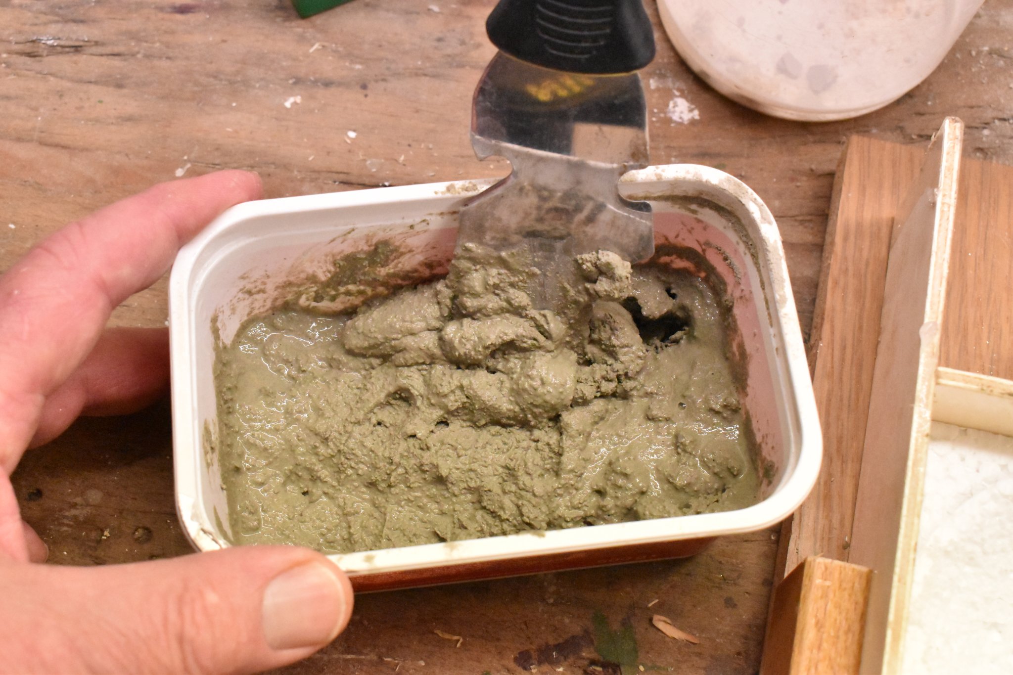 • Späne (ich habe Kleintierstreu im Mixer etwas kleiner gehäxelt - ist aber nicht unbedingt erforderlich) auf den noch feuchten Fliesenkleber streuen und mit den Fingern andrücken. Der Fliesenkleber kann dabei einfach nachmodelliert und ggf geglättet werden. Danach die noch lockeren Späne abkippen. Anschließend 24 Stunden aushärten lassen.