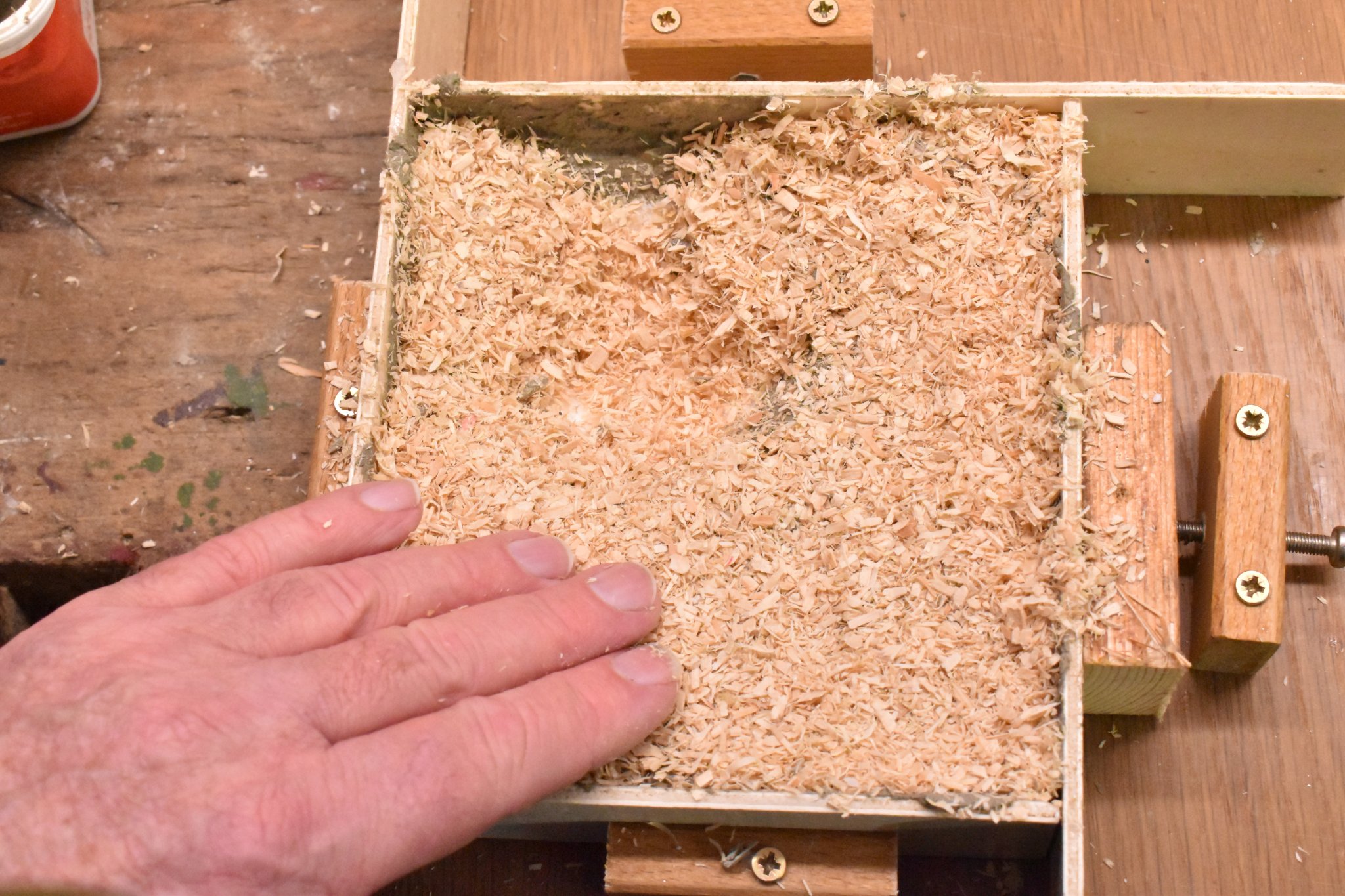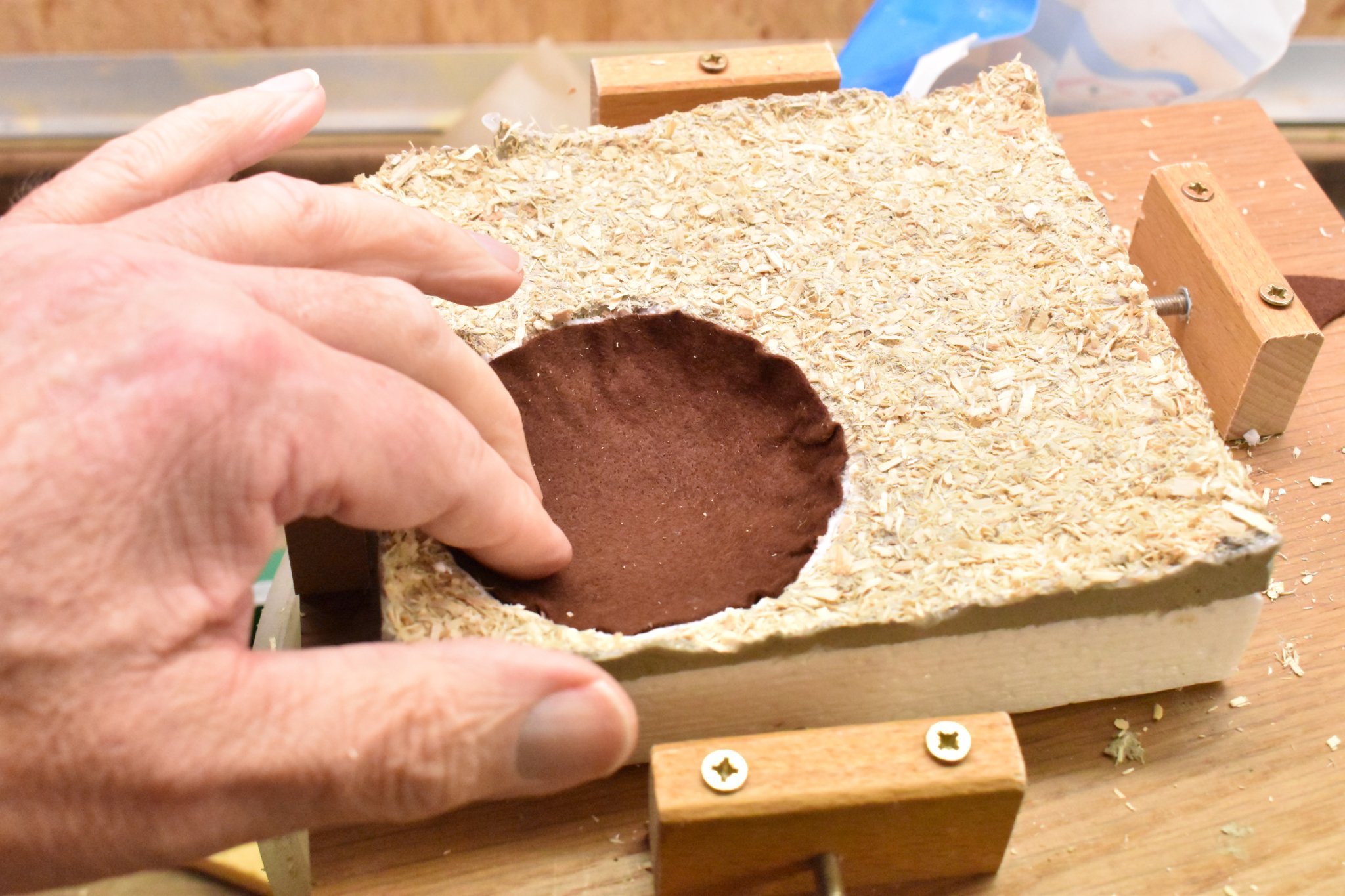 Fertig ausgefräßt. Weil die Muldenplatten in den kleinen Starenkästen sehr genau sein müssen, habe ich sie in eine Vorrichtung gespannt, die verhindern soll, dass später Fliesenkleber außen an der Muldenkonstruktion aushärtet und die Maße verändert. Für normale Nistmulden ist das nicht erforderlich!