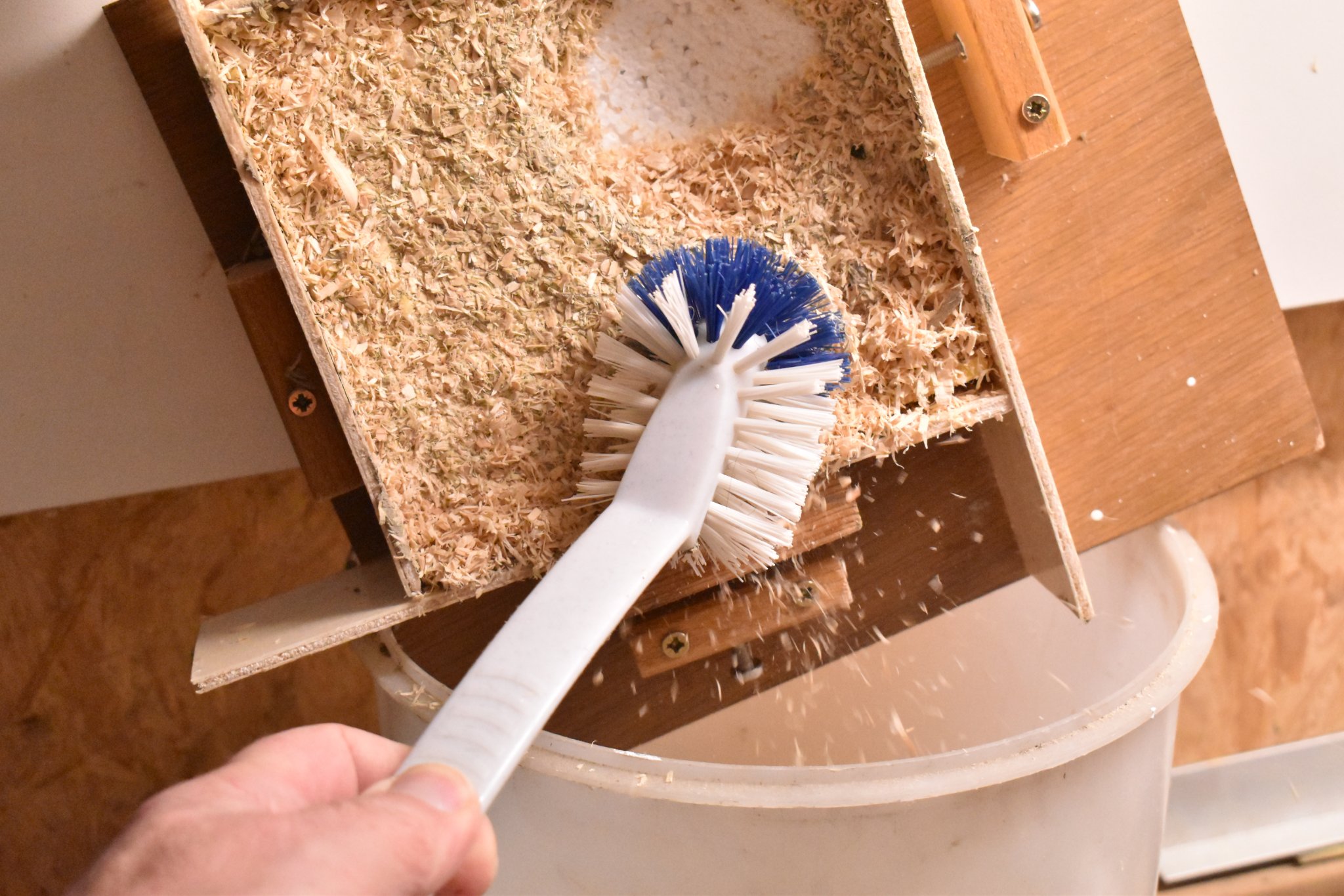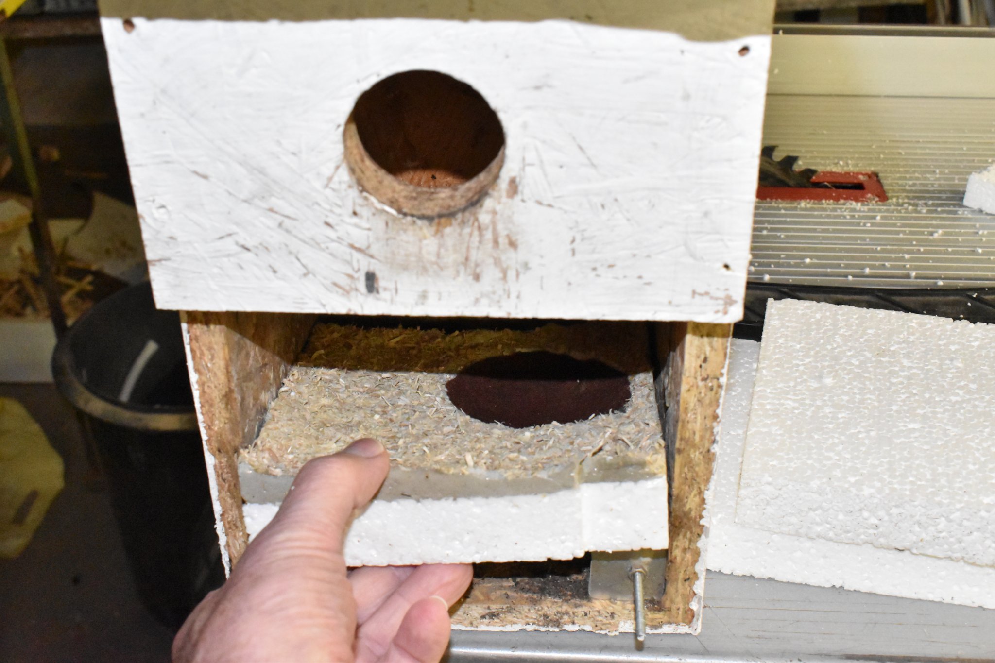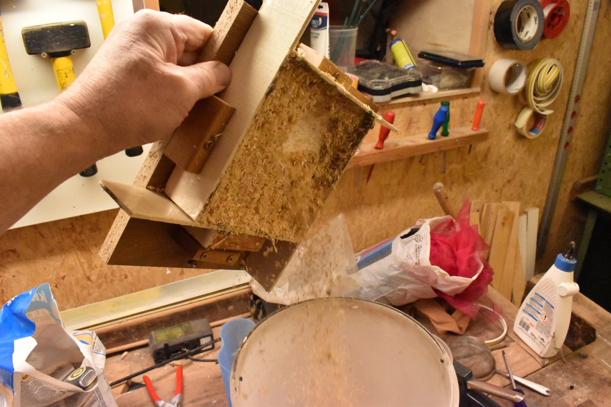 Beim fertig gefrästen Brett habe ich vorne zusätzlich eine 45°-Schräge mit der Kappsäge gesägt und das Brett anschließend als neue Nistmulde im Kasten montiert.