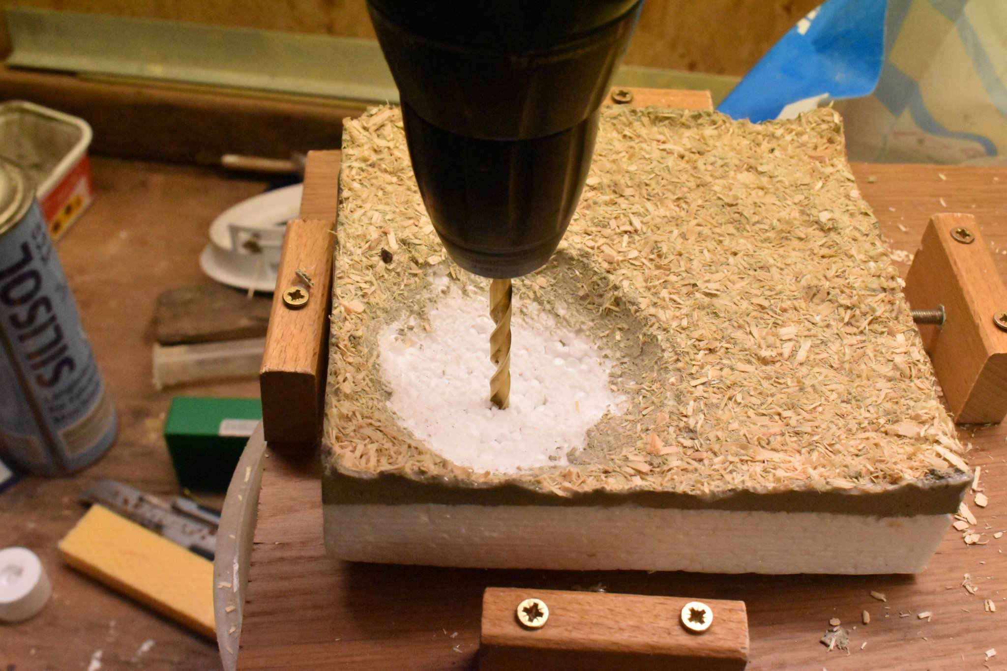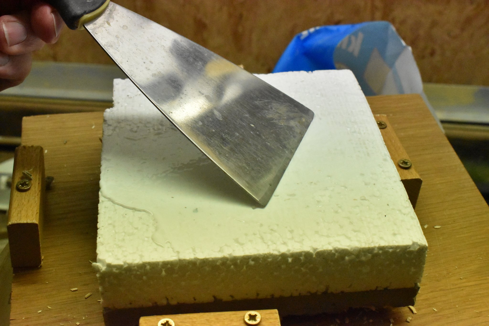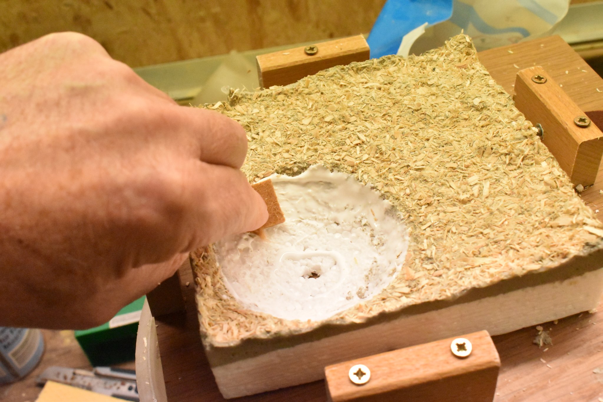 • Nach 24 Stunden werden die überflüssigen, lockeren Späne mit einer weichen Bürste abgefegt und die Konstruktion wird aus der Halterung genommen. Auf die Unterseite und an die Seiten wird mit einem Spachtel Holzleim aufgetragen. Dieder gibt dem ganzen deutlich mehr Festigkeit und verhindert, dass bei späterem Handling Stüropor-Stückchen ausgebrochen werden. Einige stunden aushärten lassen