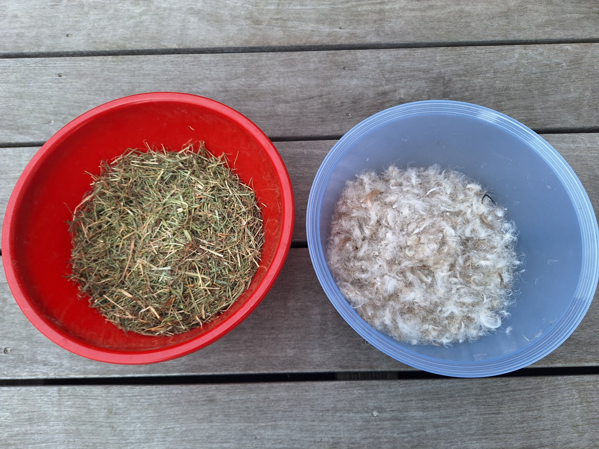 Das dünne , biegsame Heu schneide ich ungefähr auf 5 cm ( wenn ich jetzt schaue ist’s wohl doch nicht so kurz, wie es erst aussah ), Federn nehme ich eher so um die drei Zentimeter lang , sie tragen aber auch größere ein .