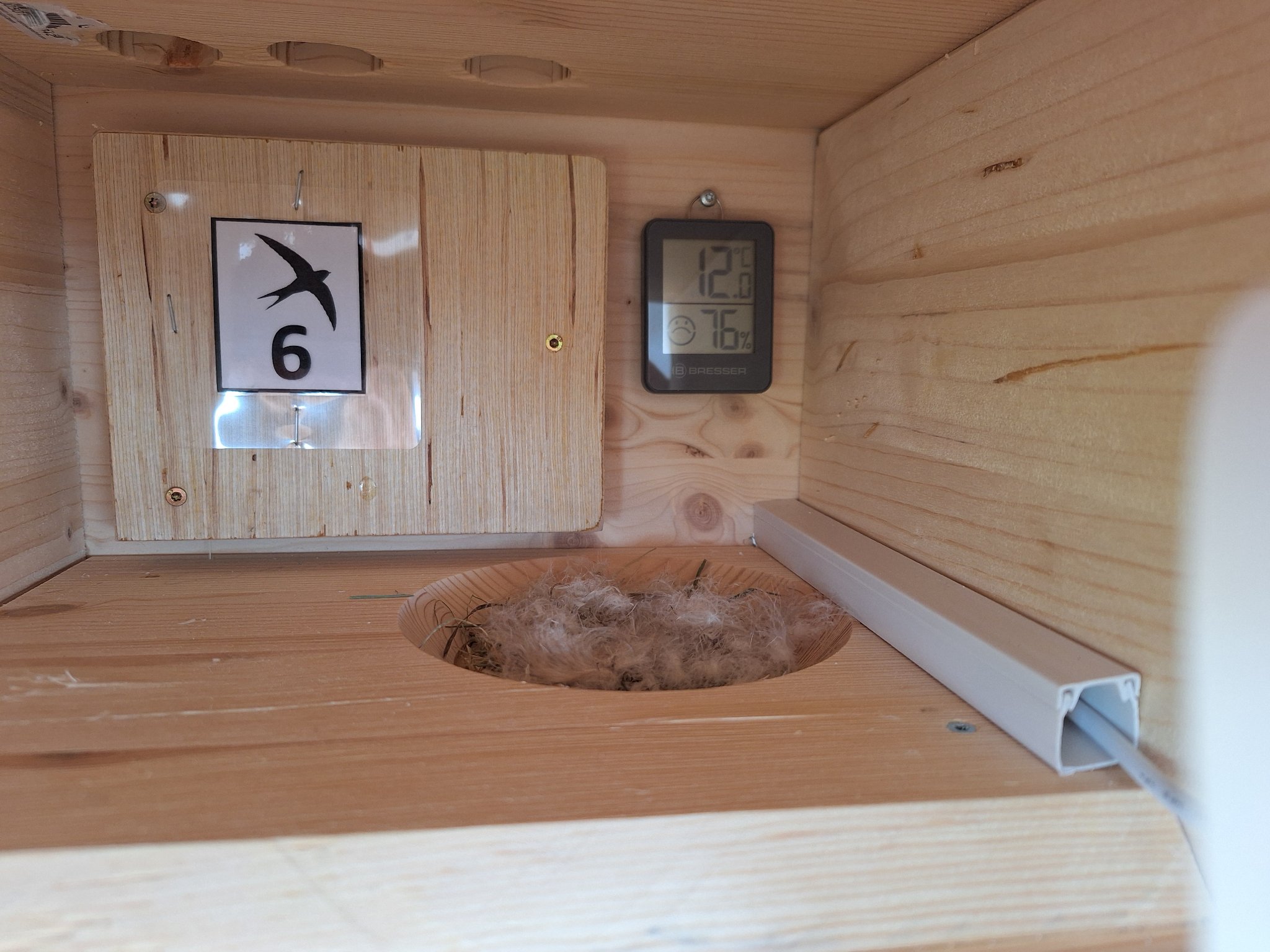 Diese Variante habe ich letztes Jahr in allen Nestern verbaut, und ich finde sie sehr gelungen: Es kommt nur selten zu „Rolleiern“, da Eier, die auf die Kante geraten, von den Seglern leicht wieder in die Mulde zurückgestupst werden können. Das Gleiche gilt für Jungvögel: Sie können zwar kurz aus der Mulde klettern, gelangen aber ohne großen Kraftaufwand schnell wieder hinein.