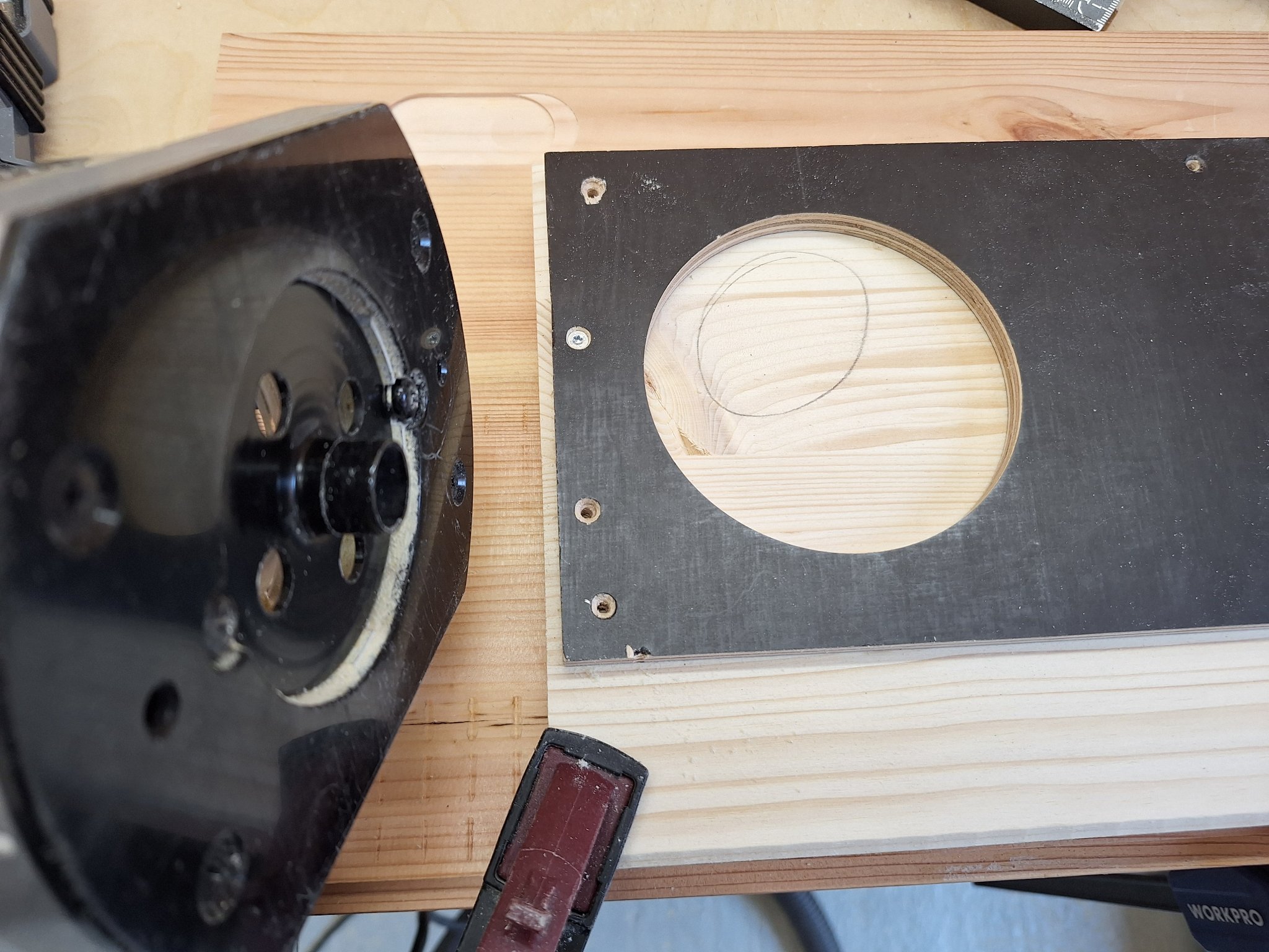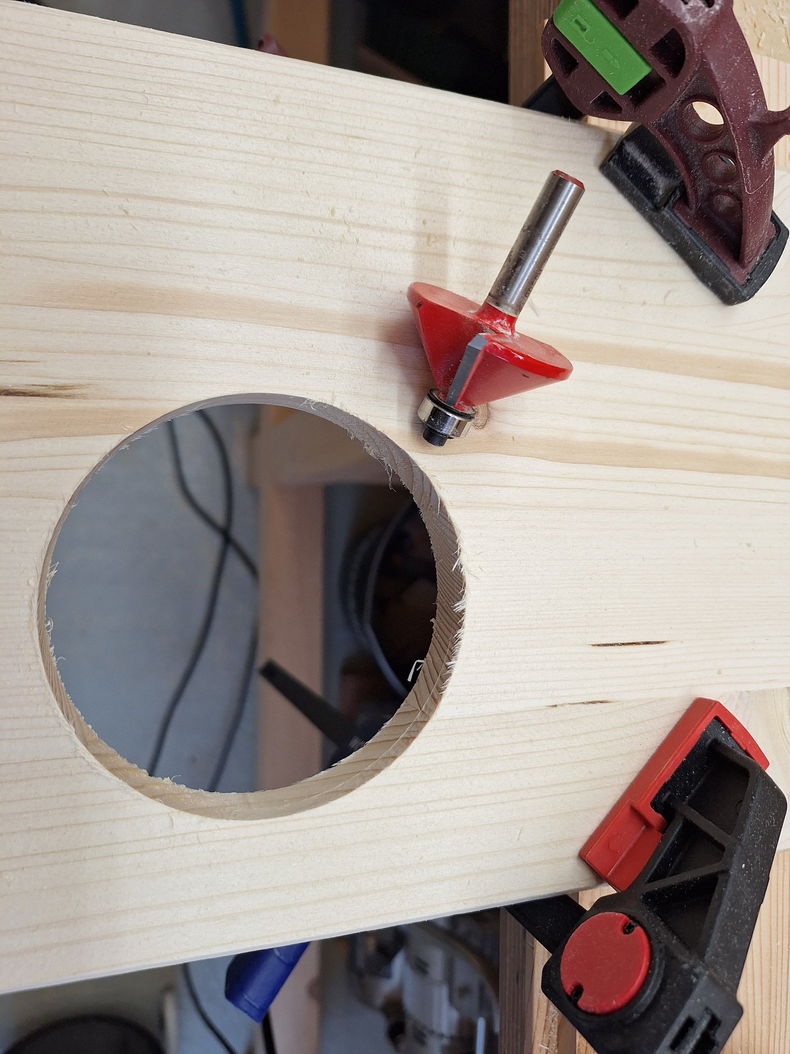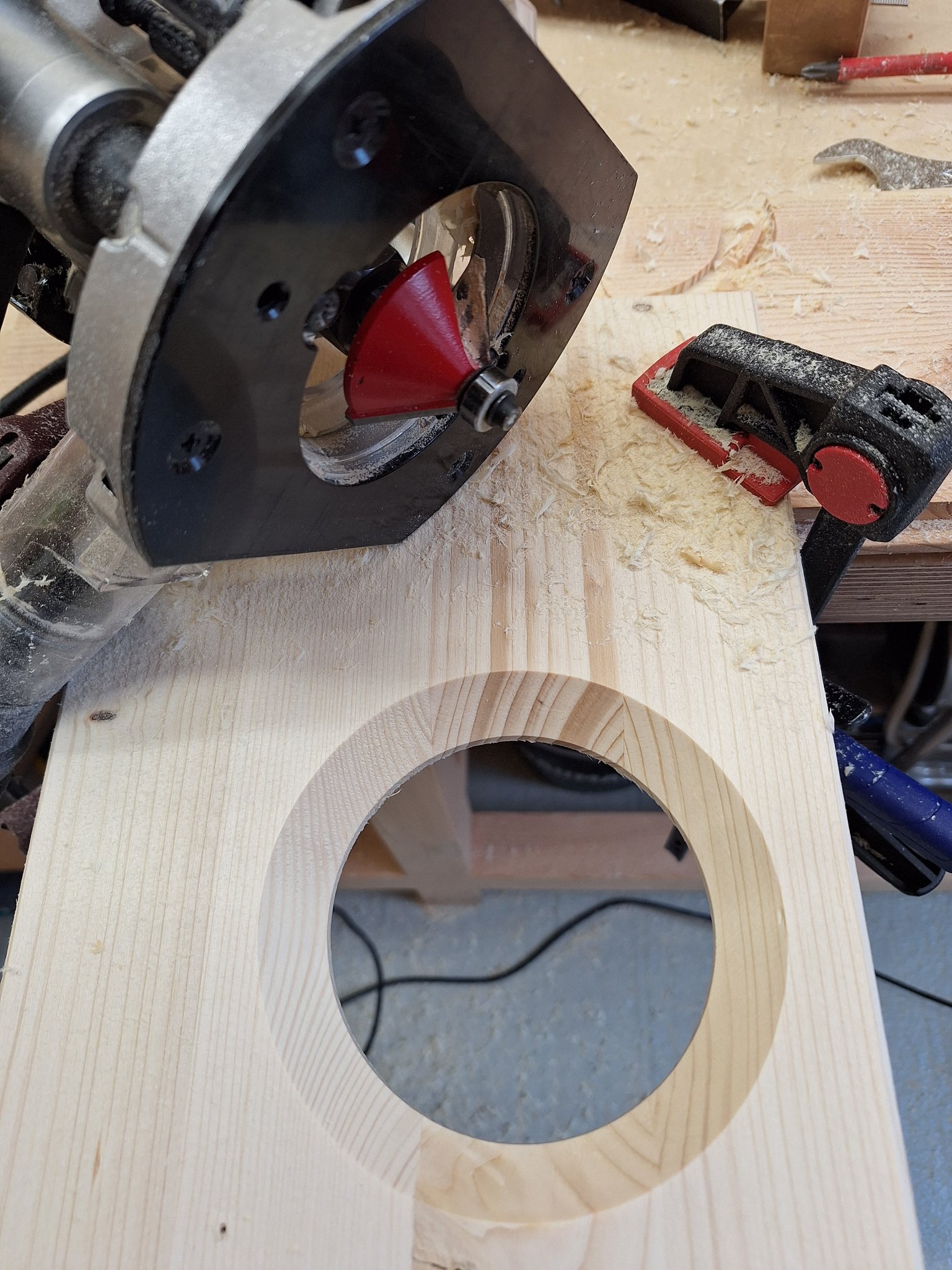 ich habe zuerst mit einer Kreisschablone sowie einer Oberfräse mit Kopierhülse und 10-mm-Schaftfräser einen runden Kreis in das Brett gefräst.