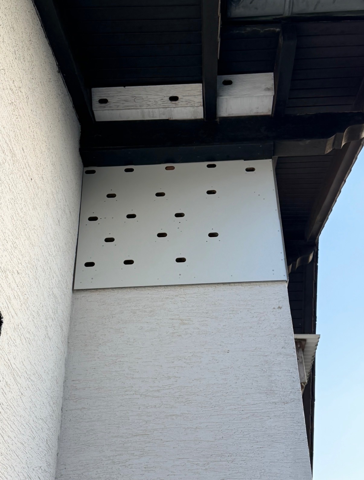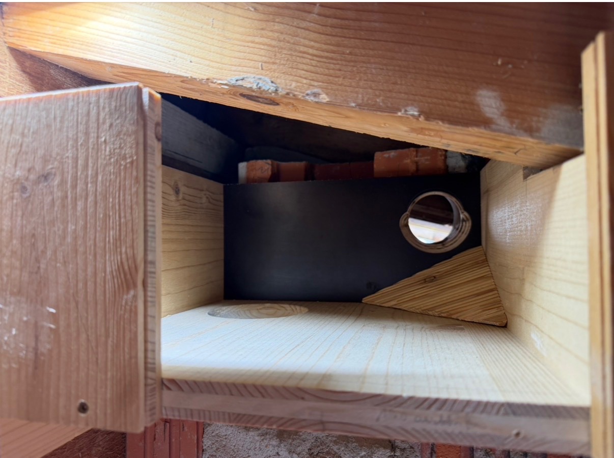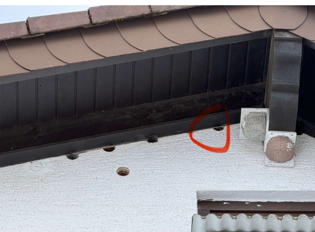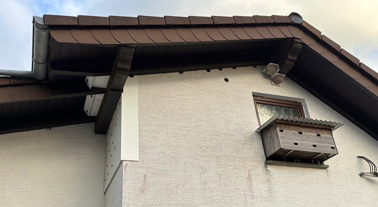 Ebenso hat das vormals runde Loch rechts oben , darin hat sich '25 ein VP angesiedelt ,jetzt durch die neue Verkleidung ein Langloch als Einflug bekommen .