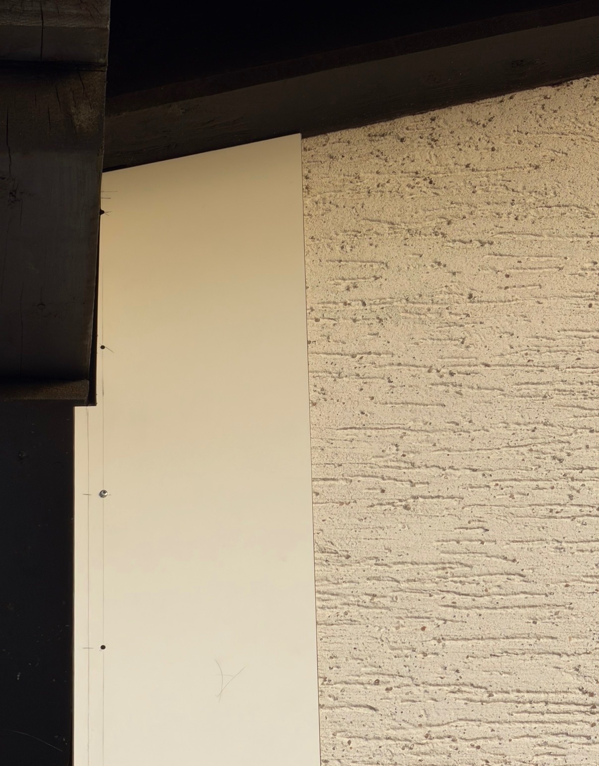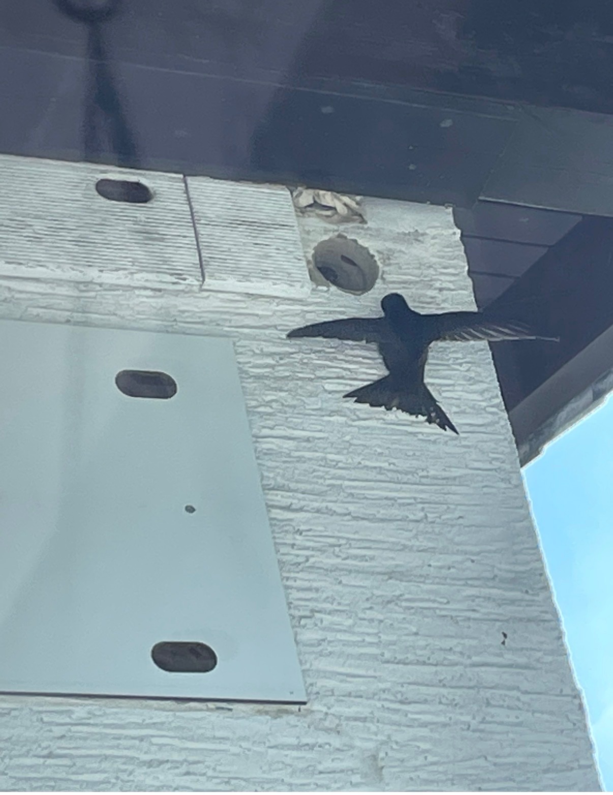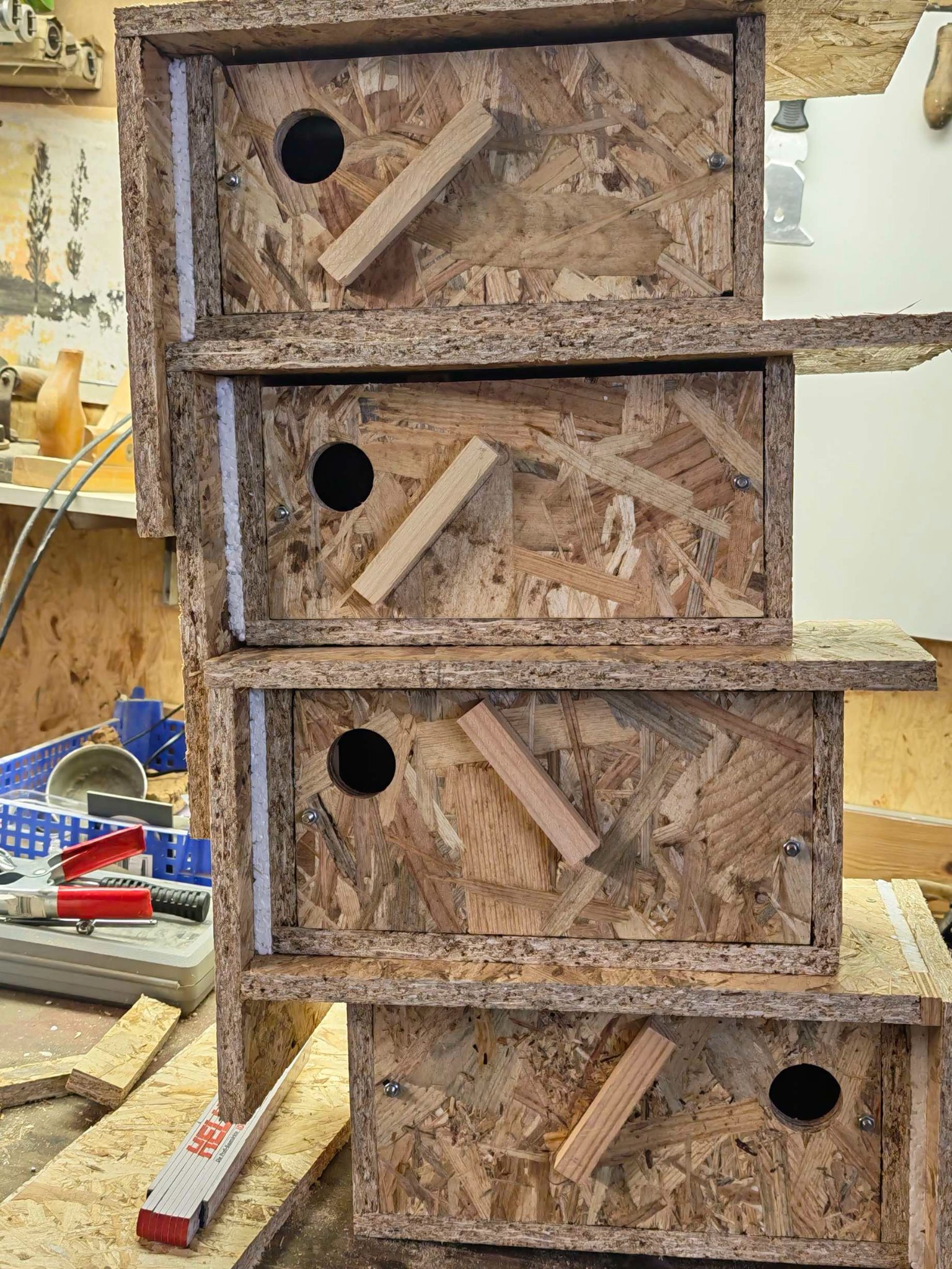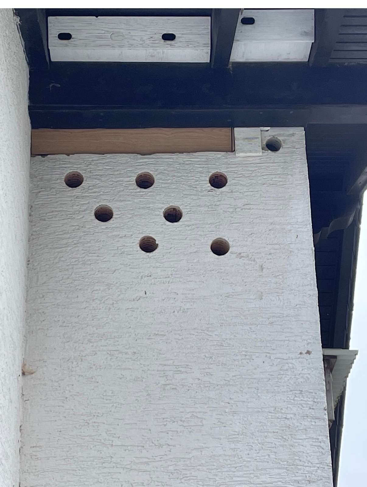 Ebenso hat das vormals runde Loch rechts oben , darin hat sich '25 ein VP angesiedelt ,jetzt durch die neue Verkleidung ein Langloch als Einflug bekommen .